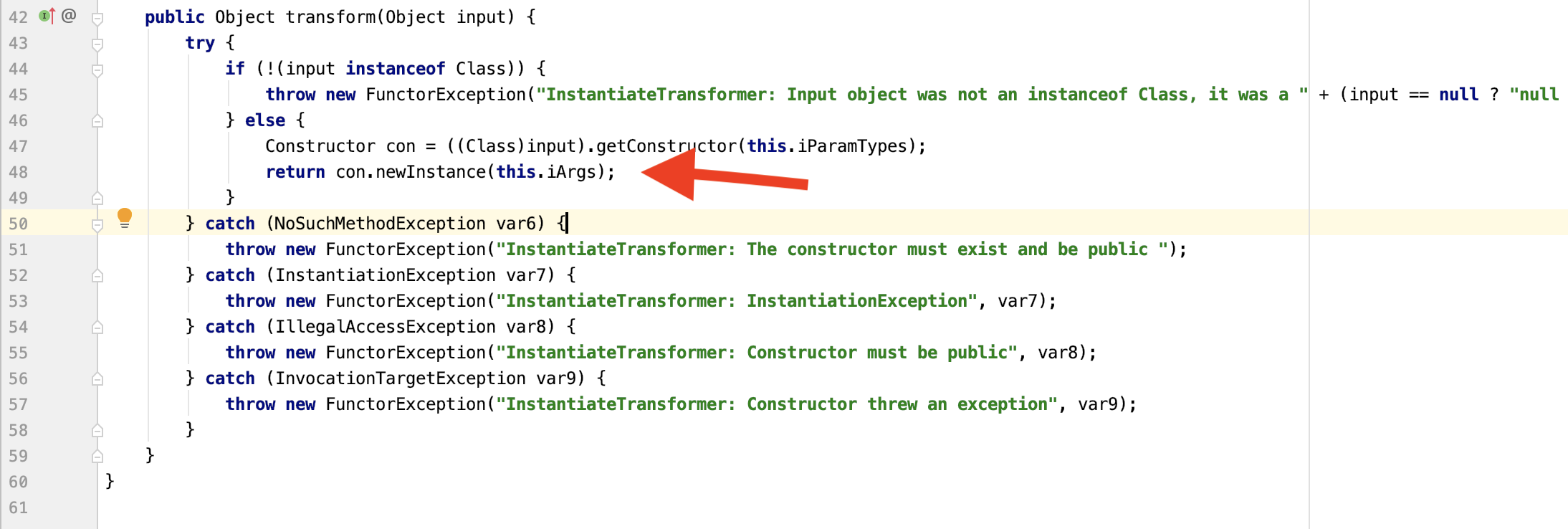 之前的CommonsCollections1使用的是InvokerTransformer的transform,因为该函数实现了反射调用任意类的功能。而CommonsCollection3使用的是新的Transformer类InstantiateTransformer 类。该类有什么作用呢?接下来会对其进行分析。