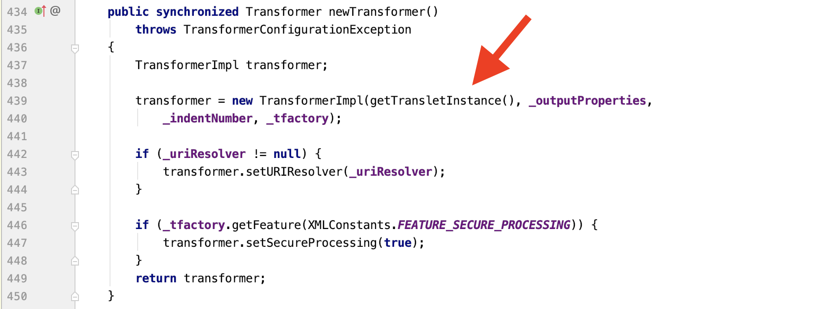跟进这个newTransformer()函数,可以发现它实例化了一个TransformerImpl类,在其中调用了getTransletInstance()函数,跟进这个函数。