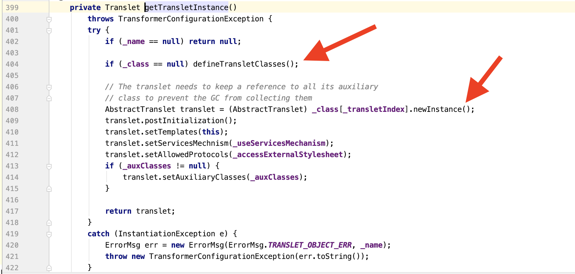 跟进这个函数后,可以看到它经过2个判断后,会调用到defineTransletClasses()函数。调用完这个函数后,在其后对_class[_transletIndex]这个类进行实例化,生成了AbstractTranslet对象。最后返回这个对象。