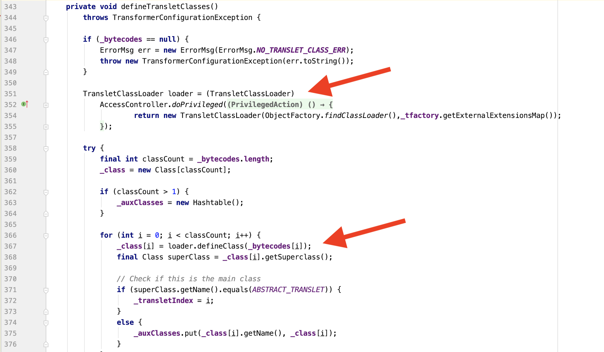 若_class[_transletIndex]的构造方法或者静态块中存在可控的命令执行,那么就会产生RCE。接下来跟进defineTransletClasses()函数。