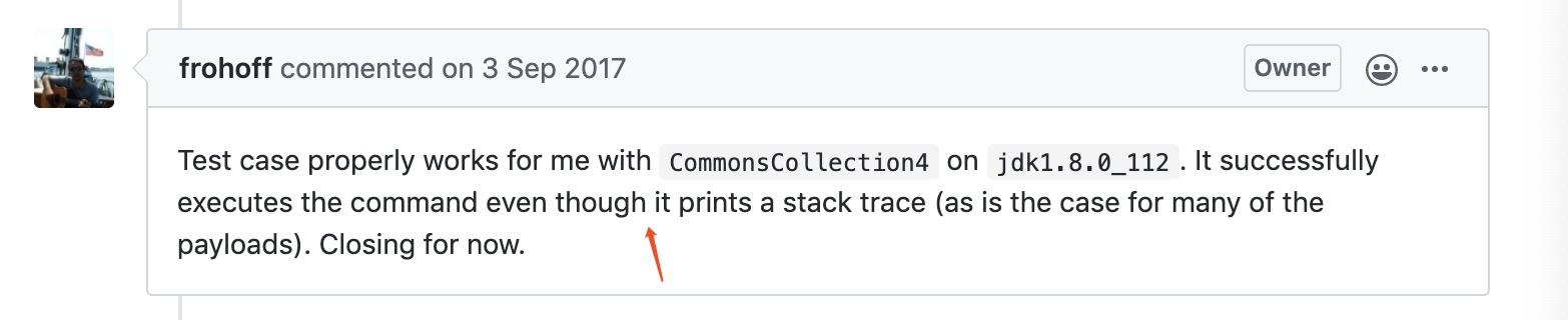可以看到弹出计算器的同时,也出现了一些报错信息。对于这些报错信息,ysoserial作者回应,在很多payload中会有这些错误的出现,但并不影响代码的执行。可参考https://github.com/frohoff/ysoserial/issues/69 。