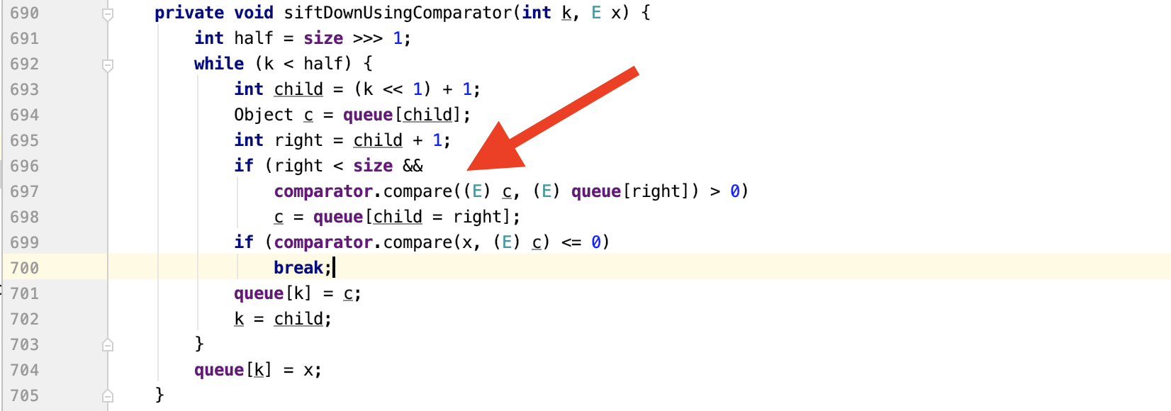 若comparator不为空,则进入了SiftDownUsingComparator函数,跟进它。