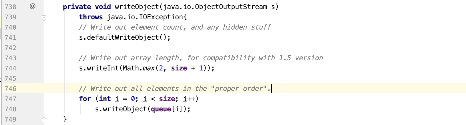可以看到在PriorityQueue类中,queue这个成员变量被transient关键字修饰,是不能被序列化的。但是在PriorityQueue类的writeObject方法中,首先调用了ObjectOutputStream中的defaultWriteObject方法,该方法会执行默认的序列化机制,在进行序列化时,会先忽略掉被transient修饰的queue字段。然后调用了writeObject方法显示地将queue字段写入到ObjectOutputStream中。
