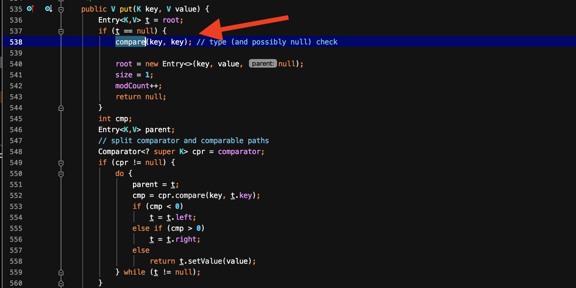 根据前面可知,传入的map为TreeMap类型,在doReadObject()函数调用了TreeMap.put(),跟进它。
