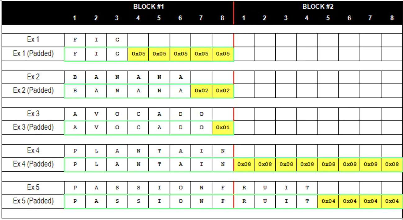 AES具有分组加密的特性。对于明文分块后不足分块大小的。就要进行明文填充。其中有种填充方式为PKCS5Padding。此种填充方式会在明文块末尾补足相应数量的字节,且每个字节的值等于缺少的字符数量。如下图所示: