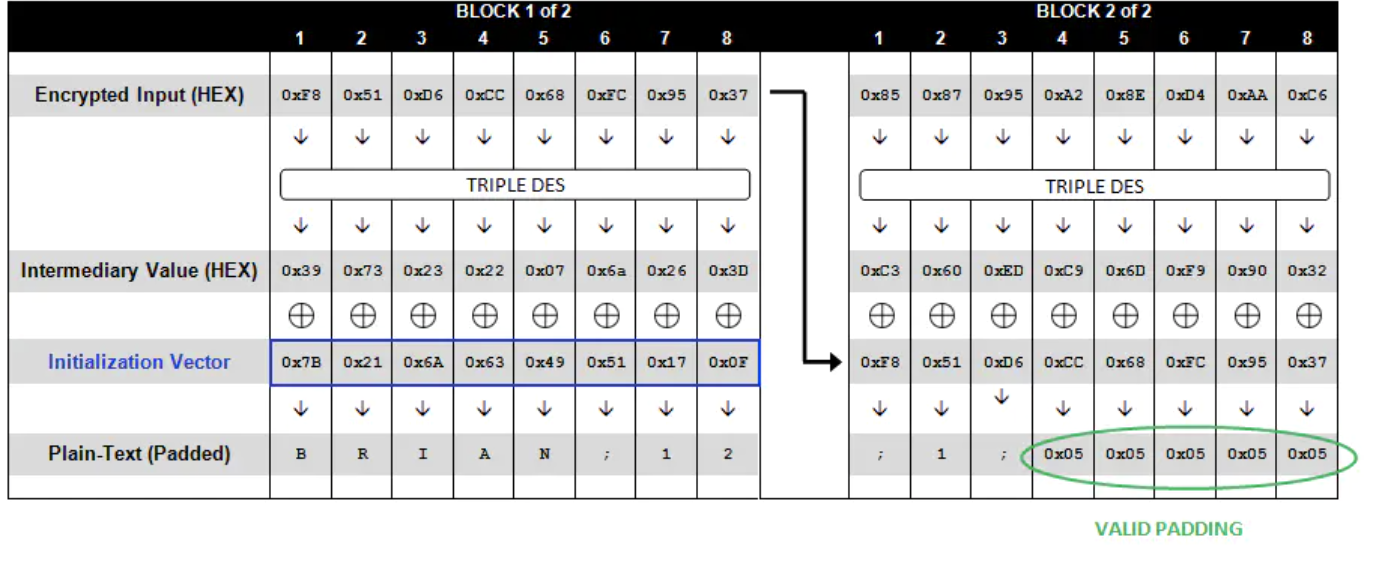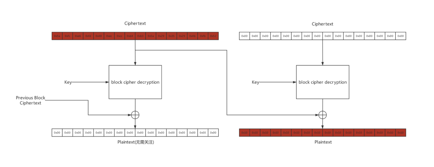 - 获取到后一个块的中间值以后,就可以利用中间值和明文,构造出前一个块的密文。(P[n] = decrept(C[n]) XOR C[n-1] => C[n-1] = decrept(C[n]) XOR P[n])。