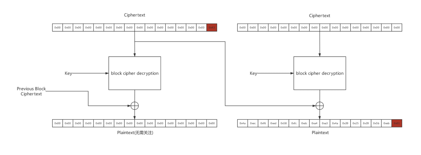- 改变空块的最后一个字节,直到不出现padding error。(此时空块的最后一个字节与后一个块的中间值异或的值为0x01)。还是依照上面的方法获取到后一个块的中间值。