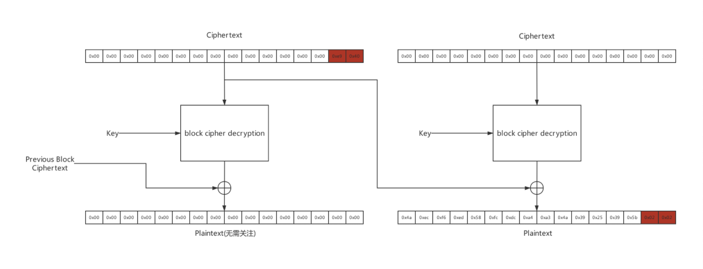 整个Padding Oracle的加密过程,就像是先获取到明文,然后使用CBC翻转攻击,使其成为特定的明文,从而构造任意明文的密文。