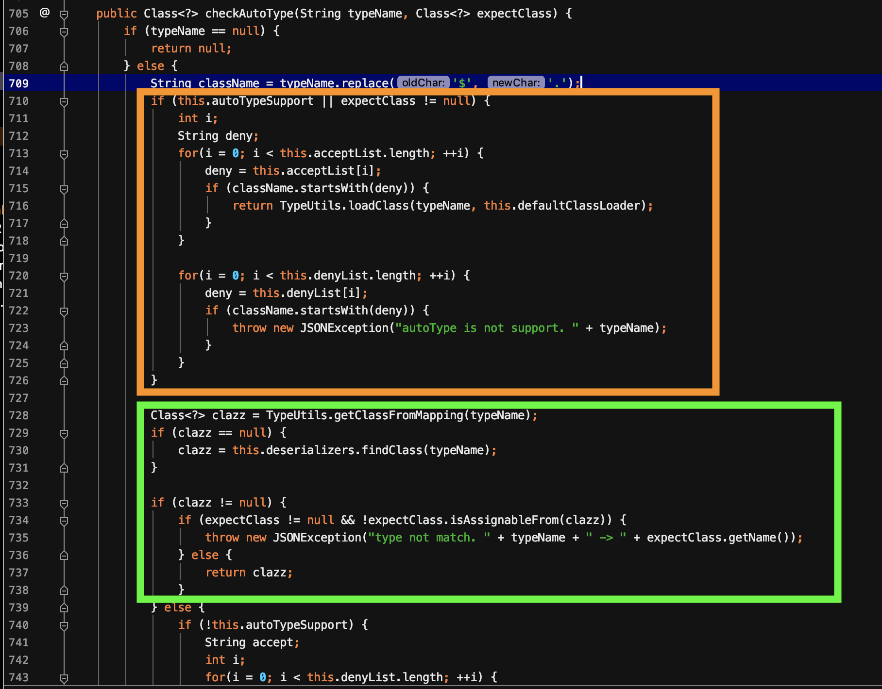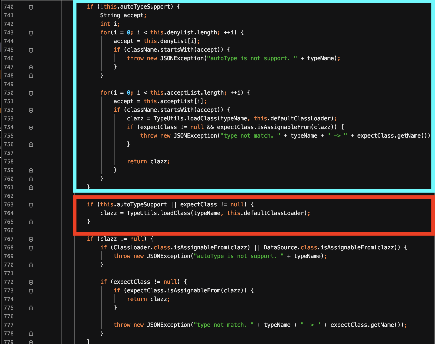 - 第三个框: 未开启autoTypeSupport,通过黑名单,再通过白名单,就加载目标类
