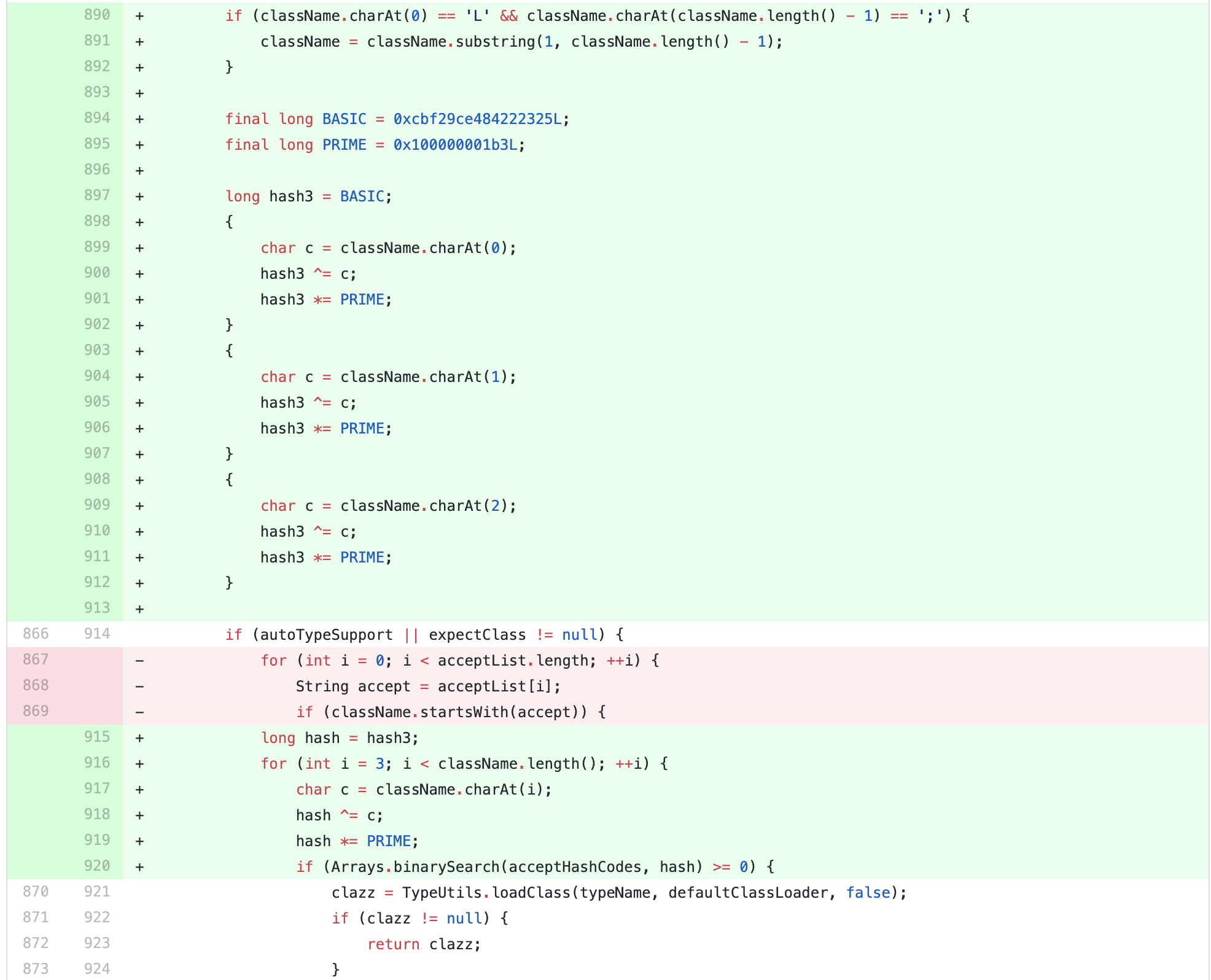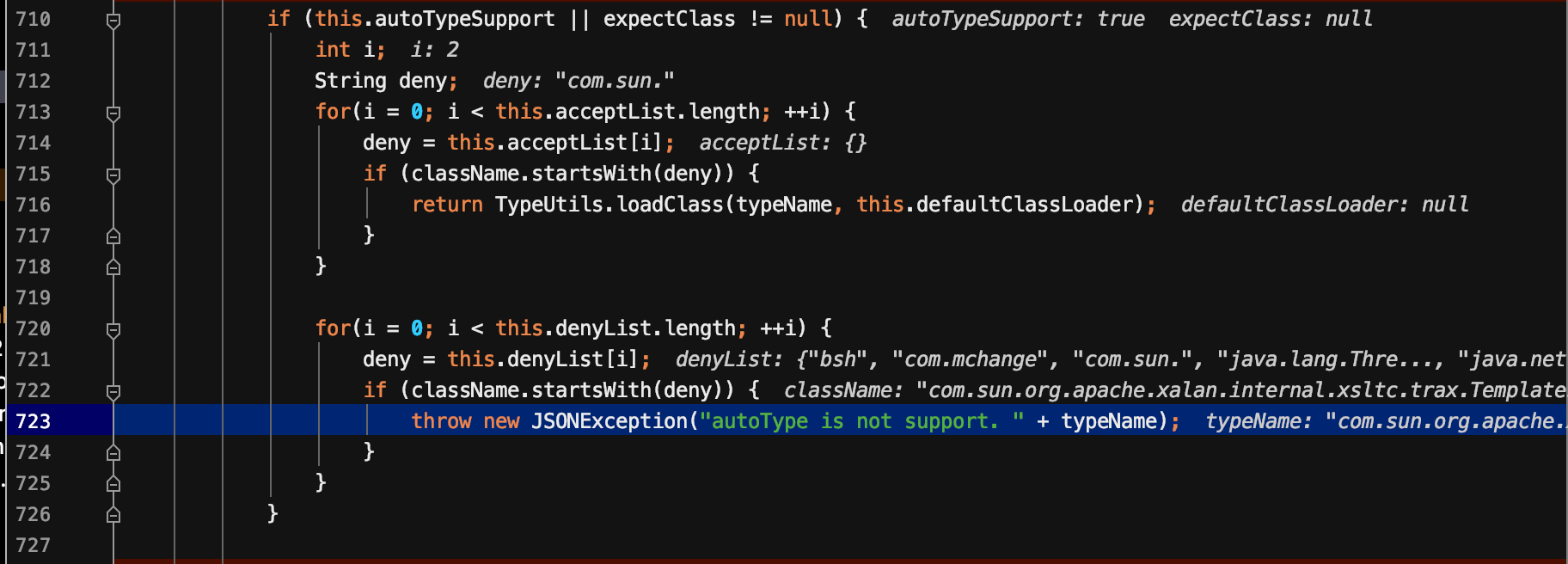从1.2.25开始,增加了checkAutoType函数,加入了黑名单+白名单来防御autoType开启的情况。而此次的漏洞就是因为在autoType开启的情况下,绕过了checkAutoType。定位到checkAutoType代码(com.alibaba.fastjson.parser.ParserConfig.class)。