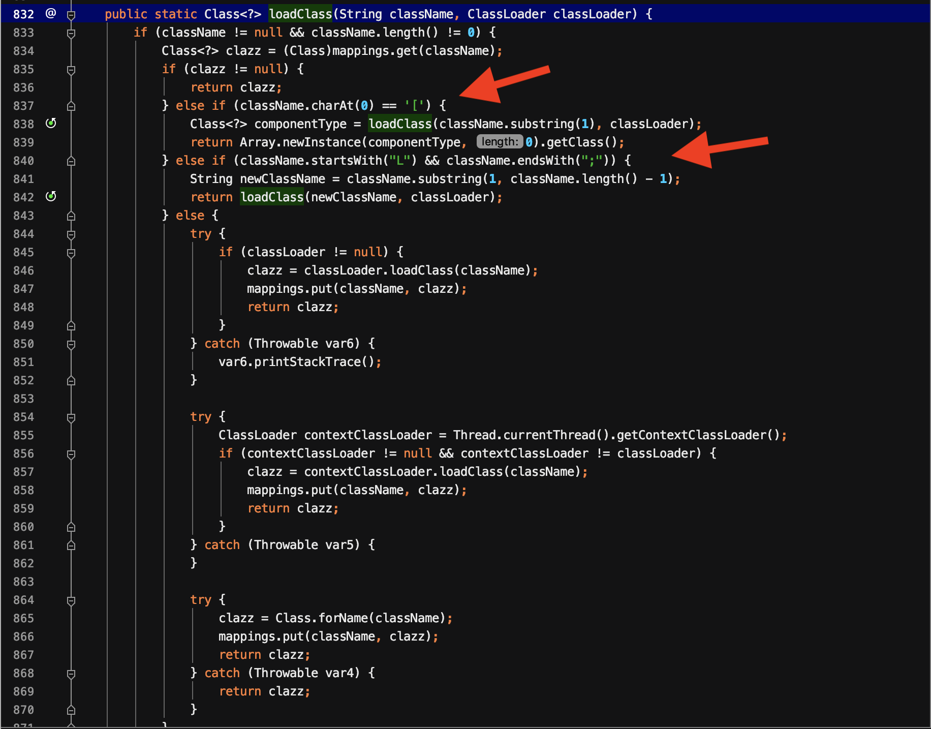 前面黑名单的判断是用startsWith()这样的函数,这就给了攻击者可乘之机。再加上以[开头会实例化一个长度为0的Array,这里会出错。因此,只能利用className以L开头。且以;结尾的方式。