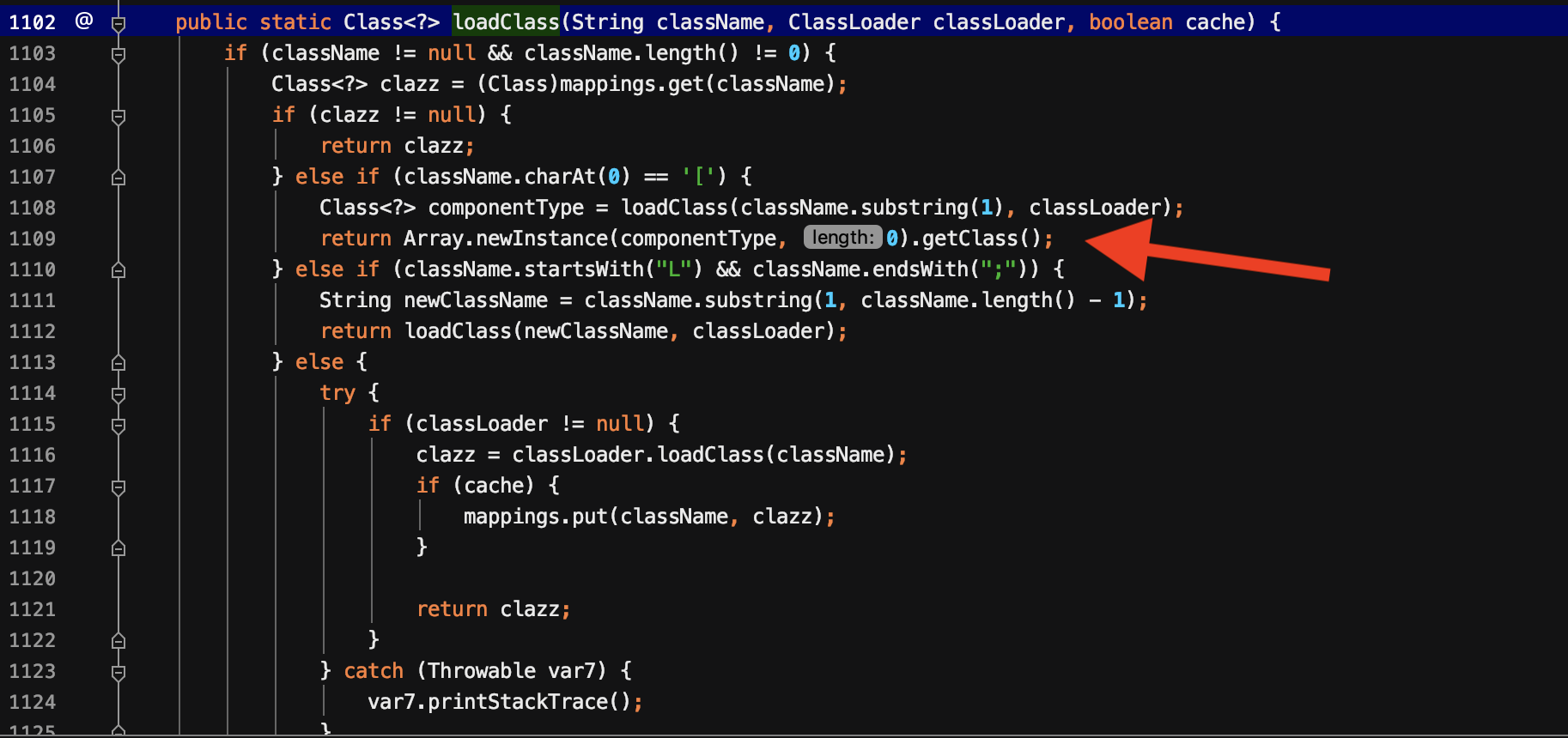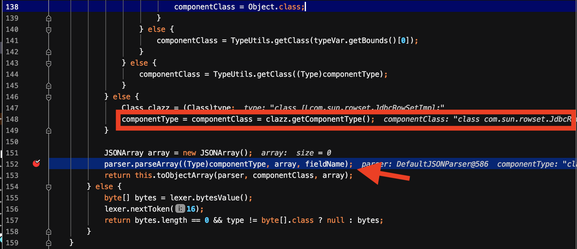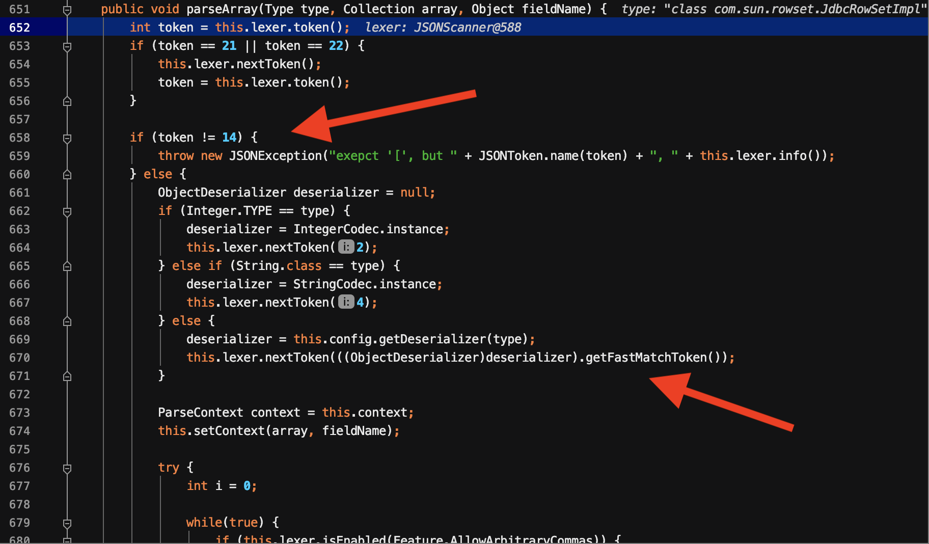 根据FastJson反序列化的流程,由于@type是一个[,因此会调用到com.alibaba.fastjson.serializer.ObjectArrayCodeC.class中的deserialze()函数,跟进去,然后定位到如下图所示的位置: