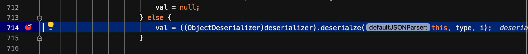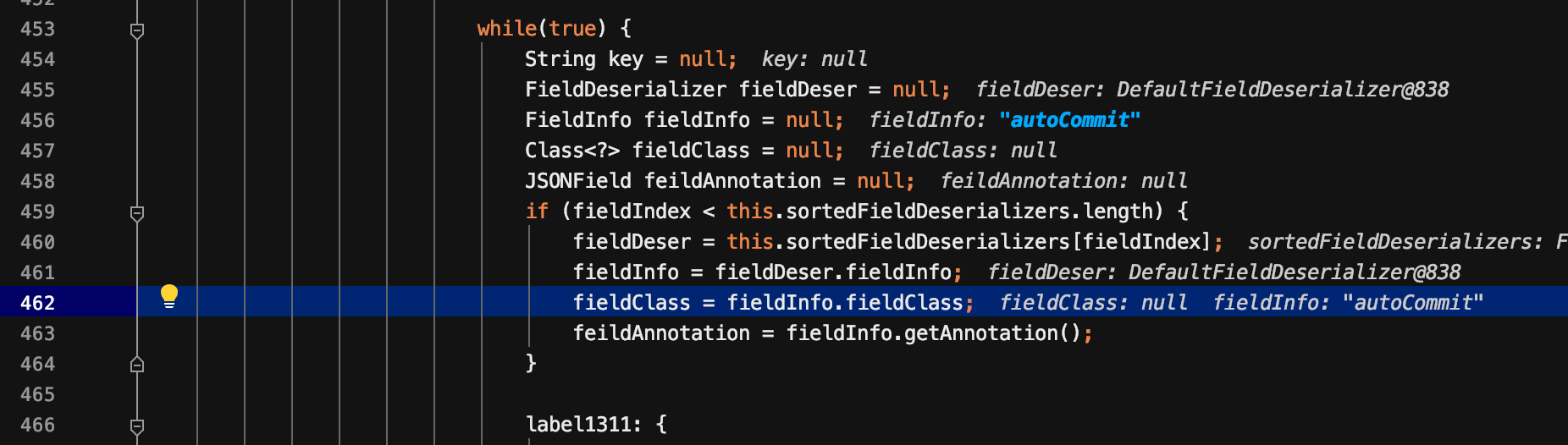 在经历完这个之后,最终会走到((ObjectDeserializer)deserializer).deserialze()函数,如下图所示: