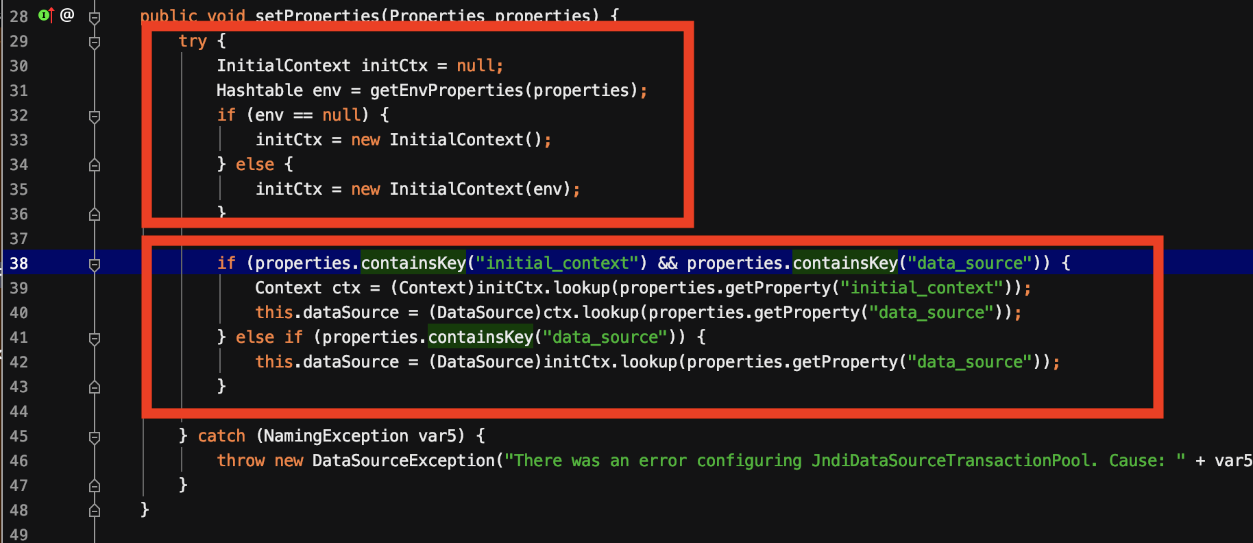 在该函数中我们可以看到,有着JNDI注入的完整的一套。接下来看看uri即properties.getProperty("data_source")是否可控。那就需要在整个的过程中也反序列化getProperties()传入的参数。定位到该函数