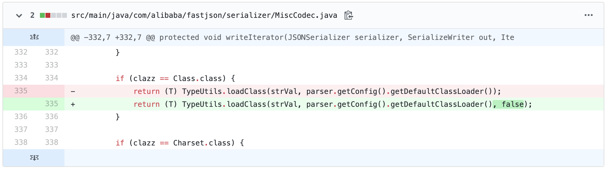 之前在fastjson回顾系列二中利用的是autotype开启的情况下,最终进入红框的loadClass,从而RCE的。而此次利用的是autotype未开启的情况下,利用第二个绿色框来达到RCE的。接下来具体看看