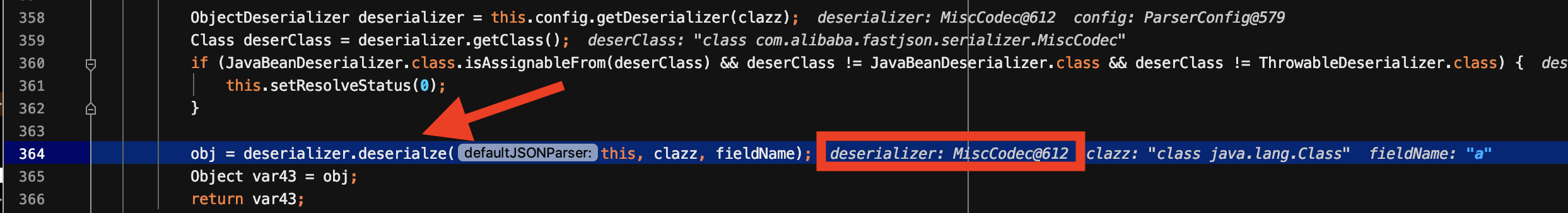 它首先利用了java.lang.class这个类,它并不在黑名单,所以可以过checkAutotype。过了checkAutotype之后,它对应的deserializer为MiscCodeC。如下所示: