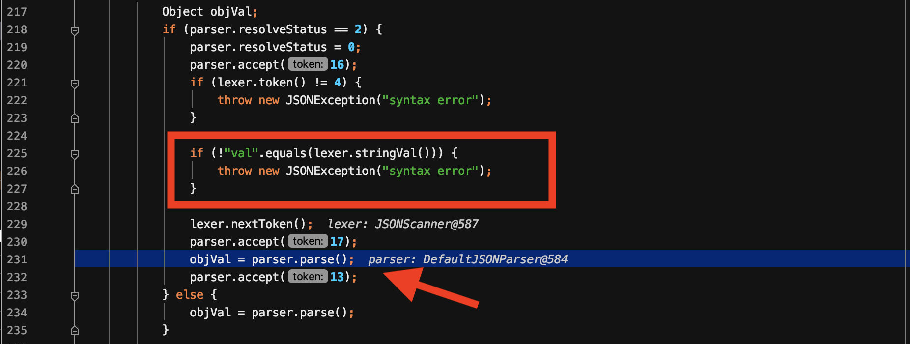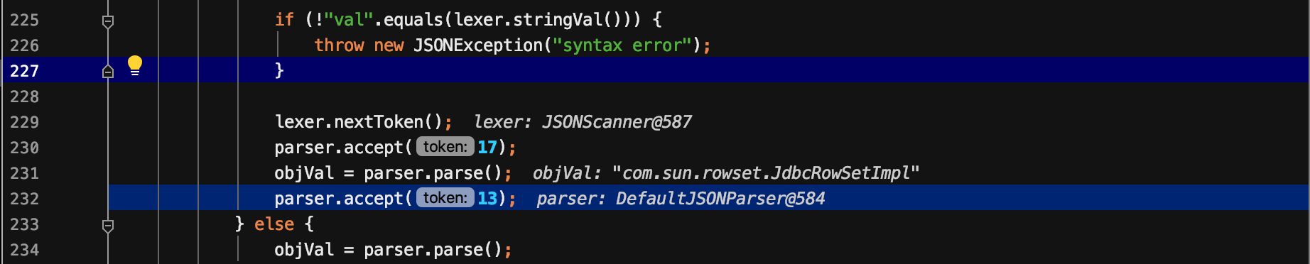 在经过判断lexer.stringVal()的值是”val”为真的情况下,经过parser.parse(),取出其值,即”com.sun.rowset.JdbcRowSetImpl”。如下所示: