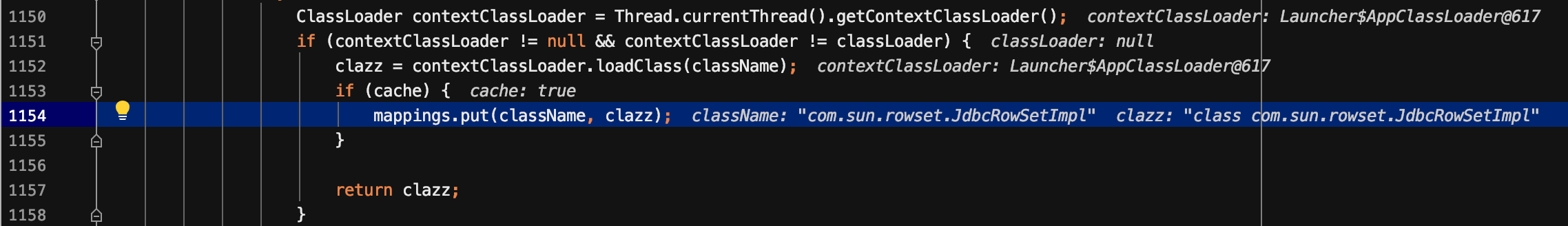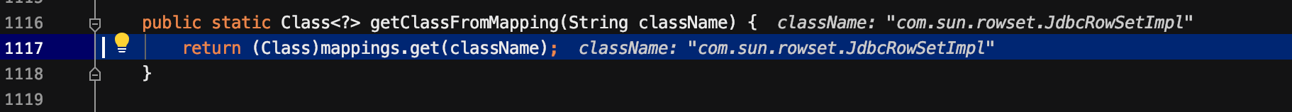 由于cache值默认为true,则进入mapping.put(className,clazz),将”com.sun.rowset.JdbcRowSetImpl”与com.sun.rowset.JdbcRowSetImpl类对应起来。