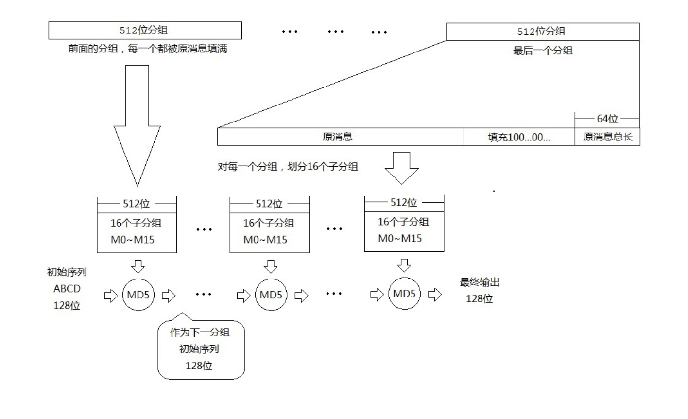 def md5(input_m): global Ti_count Ti_count = 1 abcd_list = ['0x67452301', '0xefcdab89', '0x98badcfe', '0x10325476'] ascii_list = padding(input_m) for i in range(0, len(ascii_list) // 64): aa, bb, cc, dd = abcd_list order_1 = gen_m16(m_1, ascii_list, i) order_2 = gen_m16(m_2, ascii_list, i) order_3 = gen_m16(m_3, ascii_list, i) order_4 = gen_m16(m_4, ascii_list, i) abcd_list = fun(abcd_list, F, order_1, shi_1) abcd_list = fun(abcd_list, G, order_2, shi_2) abcd_list = fun(abcd_list, H, order_3, shi_3) abcd_list = fun(abcd_list, I, order_4, shi_4) output_a = hex((int(abcd_list[0], 16) + int(aa, 16)) & 0xffffffff) output_b = hex((int(abcd_list[1], 16) + int(bb, 16)) & 0xffffffff) output_c = hex((int(abcd_list[2], 16) + int(cc, 16)) & 0xffffffff) output_d = hex((int(abcd_list[3], 16) + int(dd, 16)) & 0xffffffff) abcd_list = [output_a, output_b, output_c, output_d] Ti_count = 1 print(ascii_list) return show_result(abcd_list)
