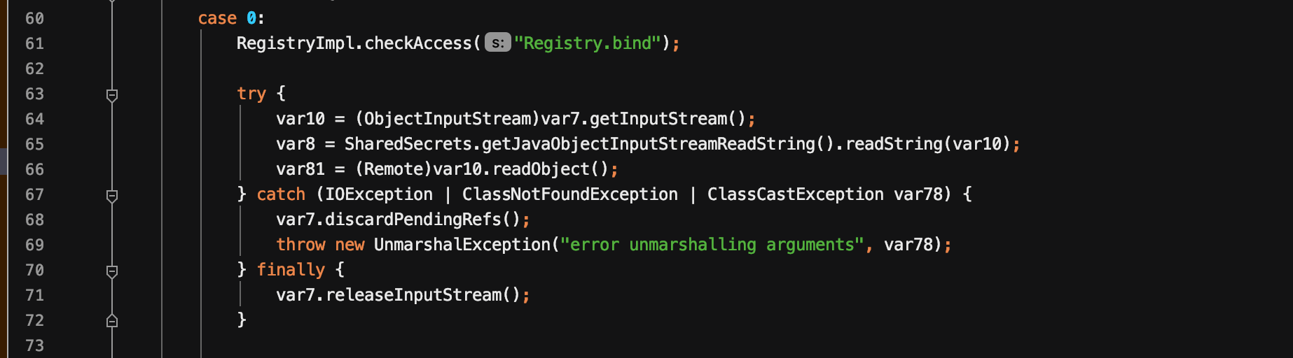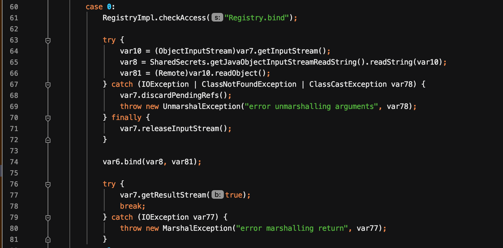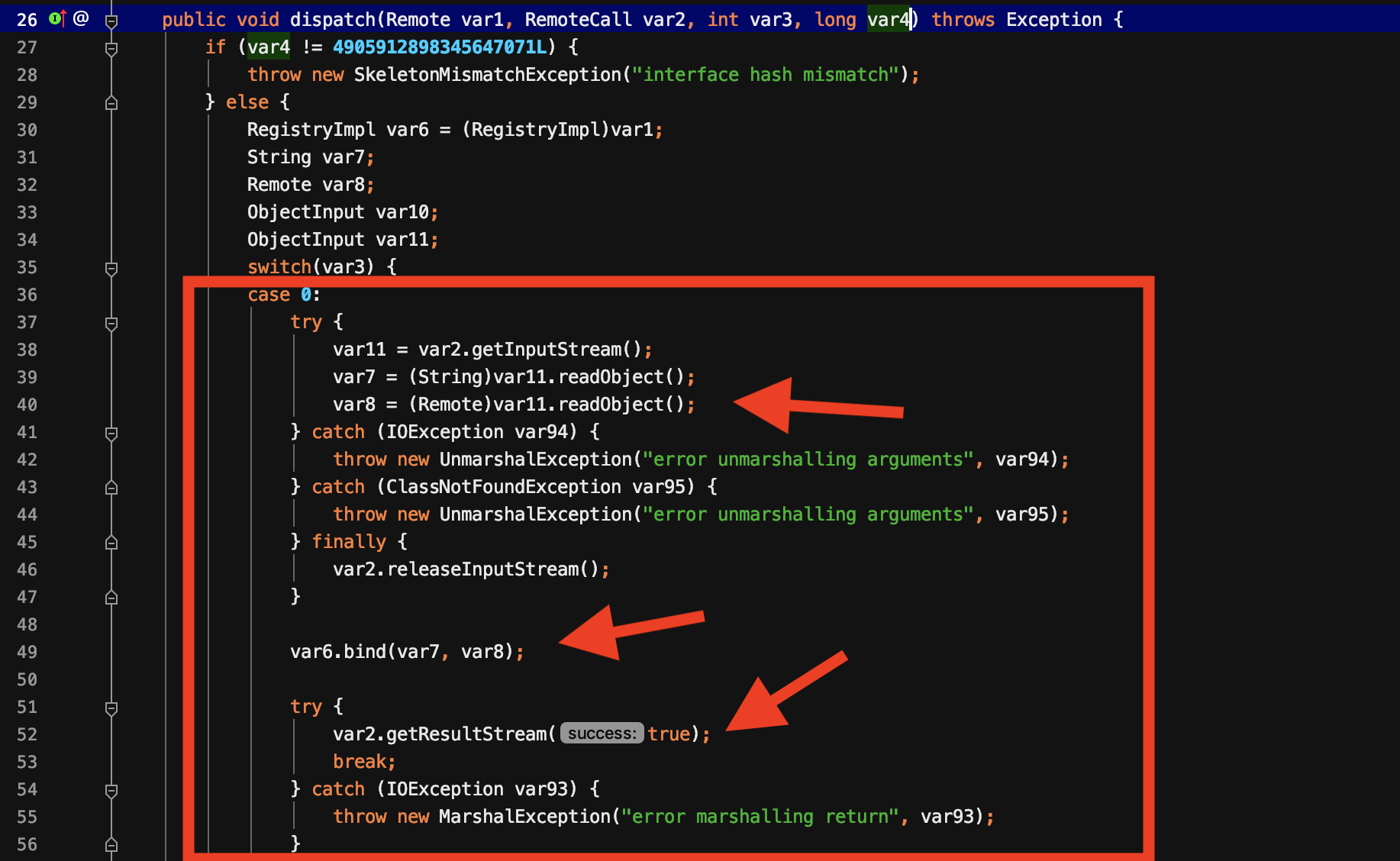 [注册中心]此时注册中心,接收数据的为RegistryImpl_Skel#dispatch。需要明白的是,RMI就是通过Stub和Skeleton在客户端和服务端传输数据。这里的var3即前面发送的opnum参数为0,即bind操作,这里直接定位到case 0:的部分。case 0中的0代表的是bind操作。