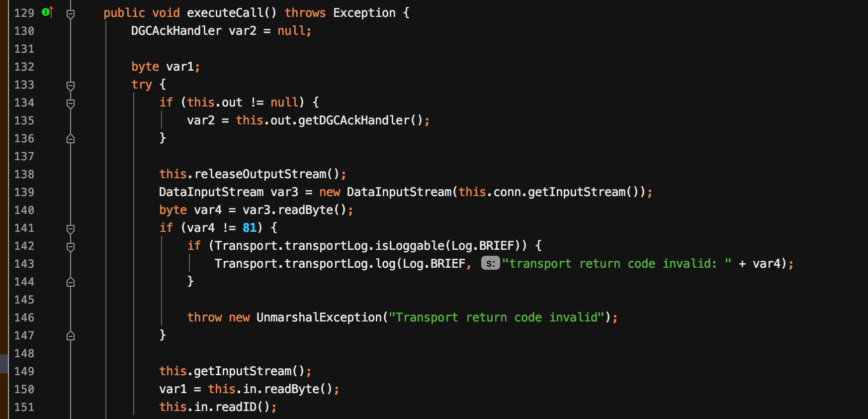 [服务端]服务端在发送完bind的数据后,接着执行super.ref.invoke()方法,其实也就是UnicastRef.invoke()方法,在这里面继续执行var1.executeCall()函数。跟进该函数。