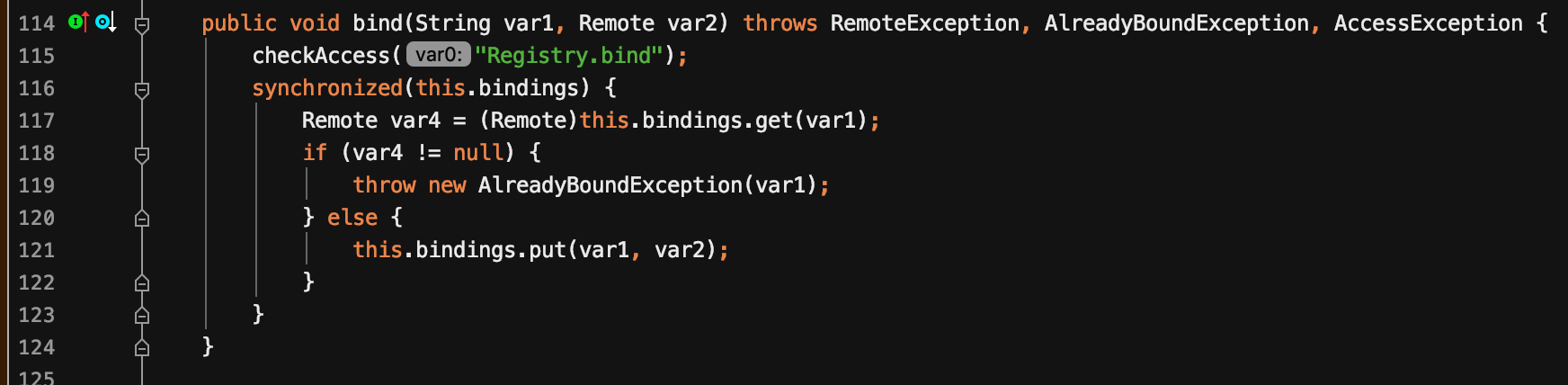 在这里可以看到,它在put函数之前,做了对于是否是本地的绑定的判断checkAccess("Registry.bind")。仅允许来自本地的bind操作。同理,可以看到,rebind/unbind操作都只能在本地完成。