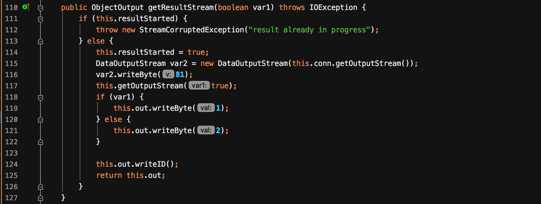 在反序列化得到参数值之后,回到dispatch方法,接着往下走,然后直接调用方法,获得方法调用的返回值var10。紧接着又到了熟悉的getResultStream(true)方法,这里会向客户端返回81、1以及ID值。