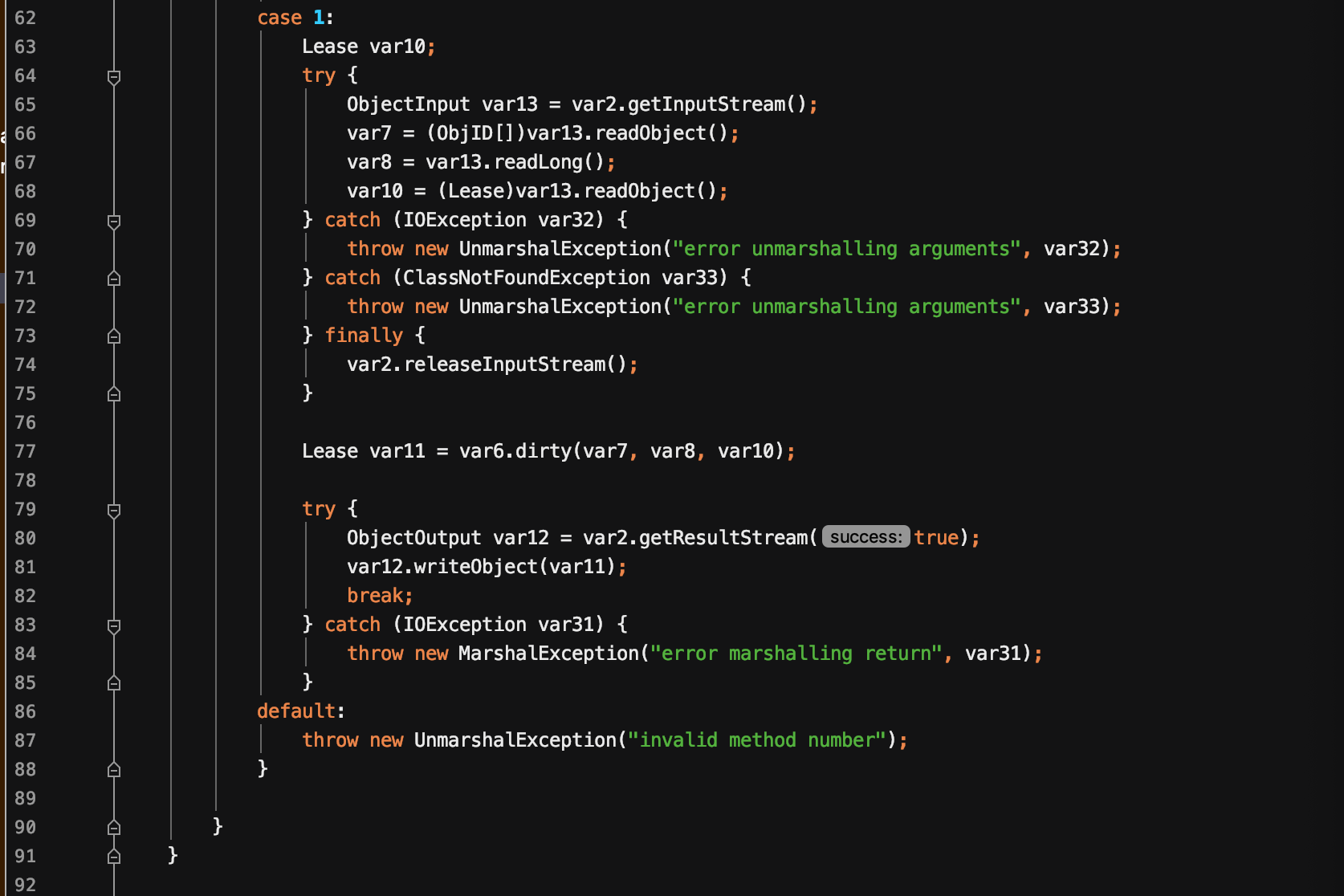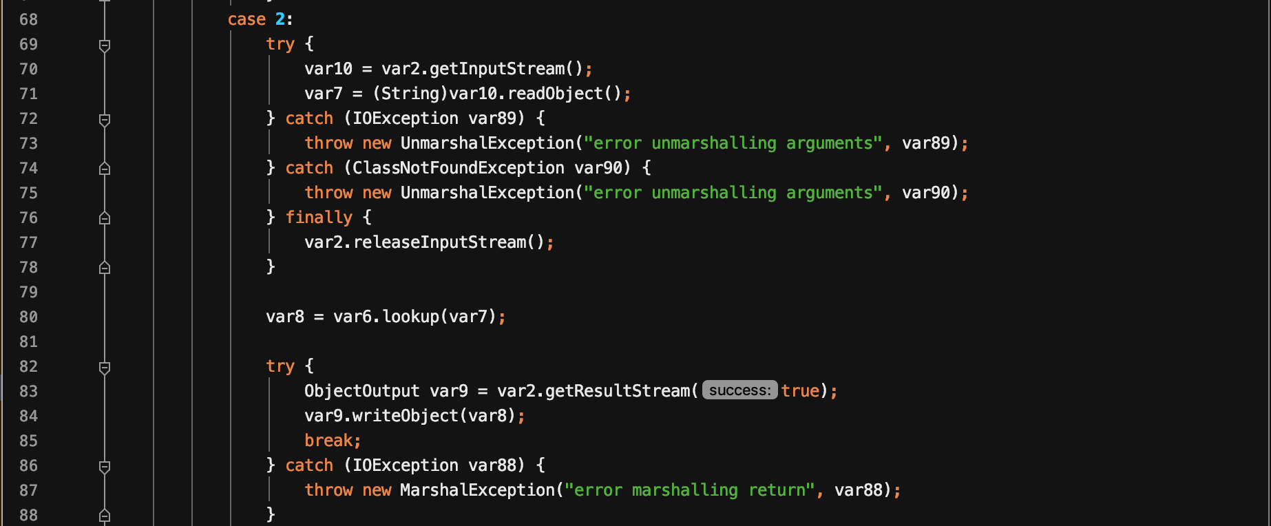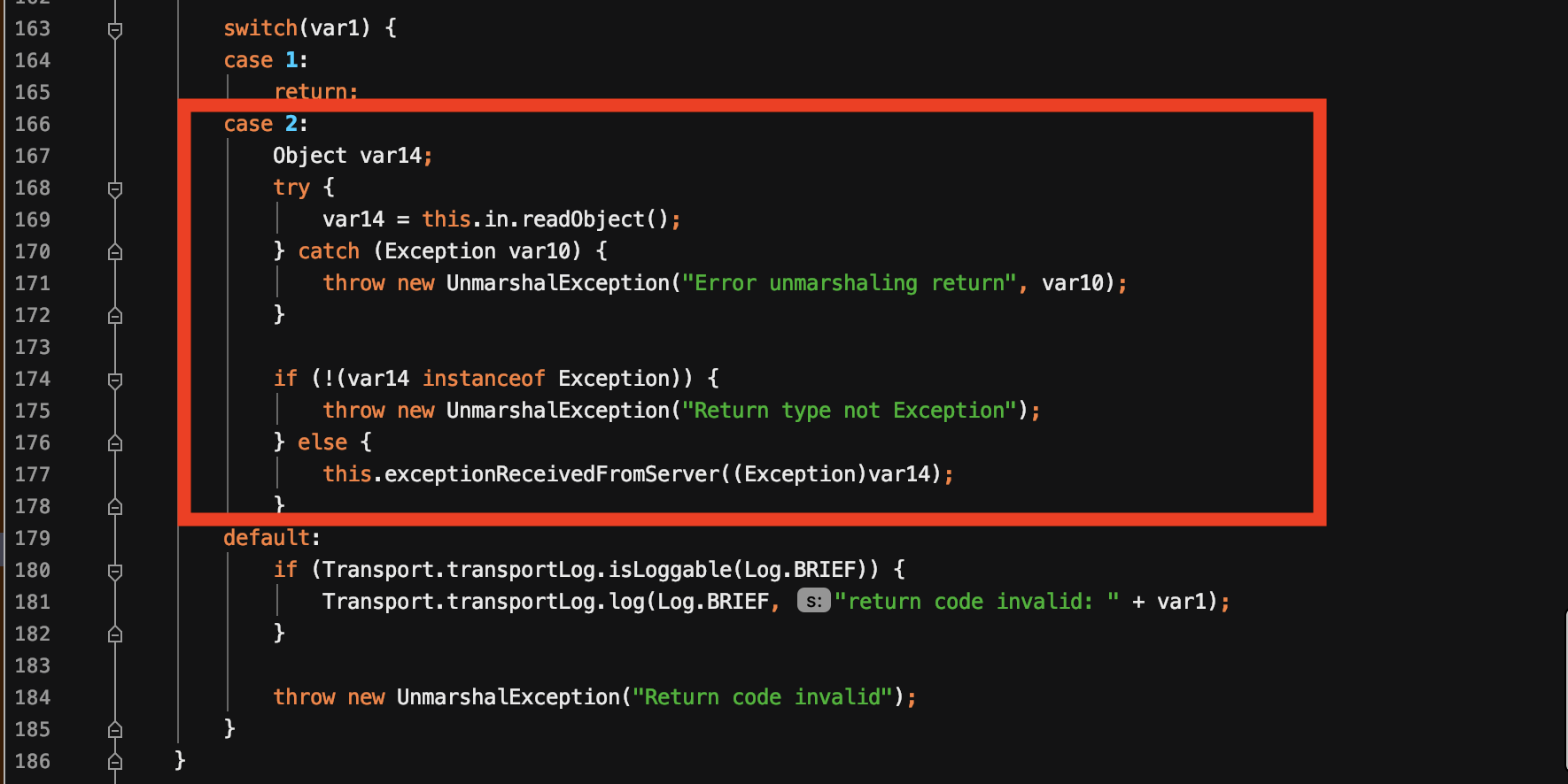 在该函数中确实接收到了注册中心的返回值,首先反序列化出var4传输返回码,该值必须为81.前面也确实传了81这个值。紧接着反序列化出var1。该值为1。因此进入case 1:的分支,直接返回了。但从代码中可以看到,若var1的值为2,则会进行反序列化。到这里整个流程分析结束了。