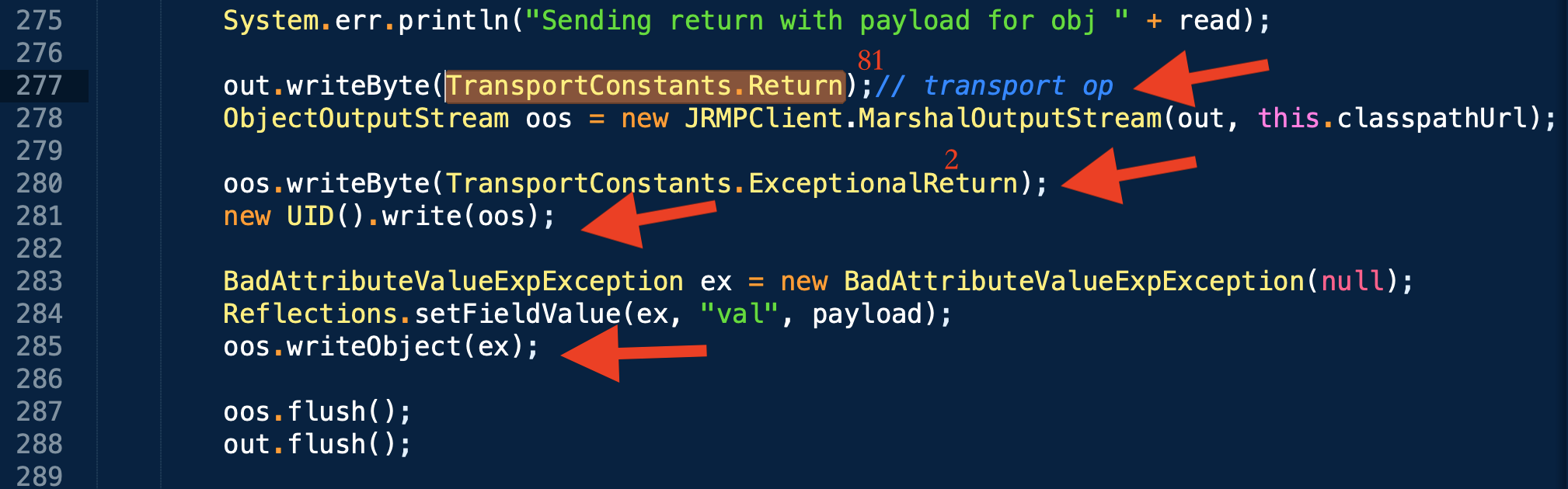 服务端在接收注册中心返回值时,若返回的是TransportConstants.ExceptionReturn,即值为2,就会进入case 2的分支,进行反序列化。因此注册中心攻击服务端的方式,就是伪造一个恶意的注册中心,向服务端返回TransportConstants.Return、TransportConstants.ExceptionalReturn、UID以及恶意的object。