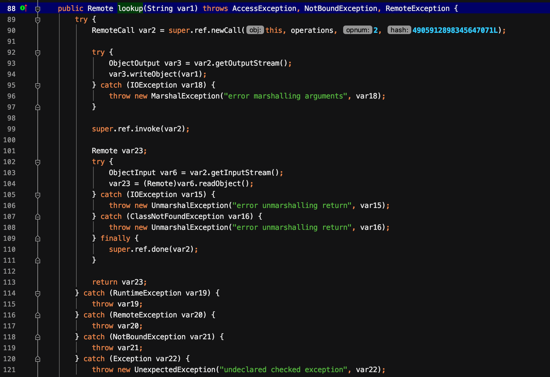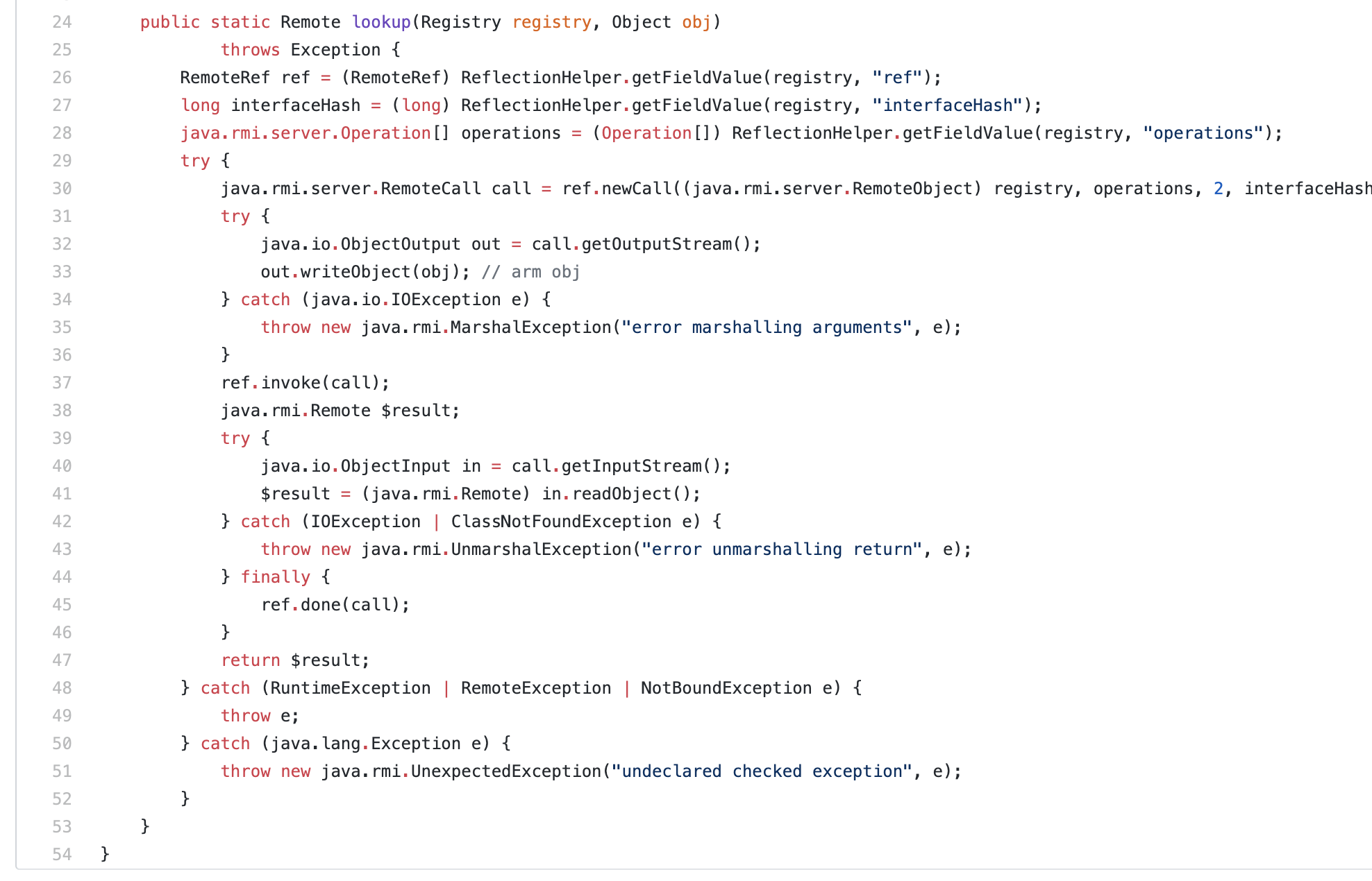 在构造lookup函数请求时,只需要重新实现lookup函数的实现。这里介绍wh1t3p1g师傅写的一个改造版lookup函数。将Naming.lookup和RegistryImpl_Stub.lookup合并在一起了。