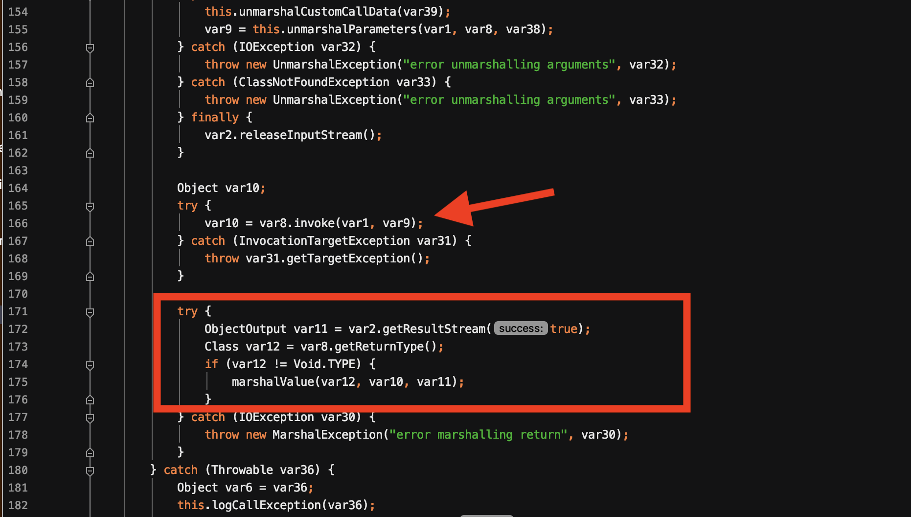 然后对方法调用的返回值进行判断,若返回值不为Void类型,进入marshalValue()方法。在marshalValue()方法中会对其进行序列化发送给客户端。