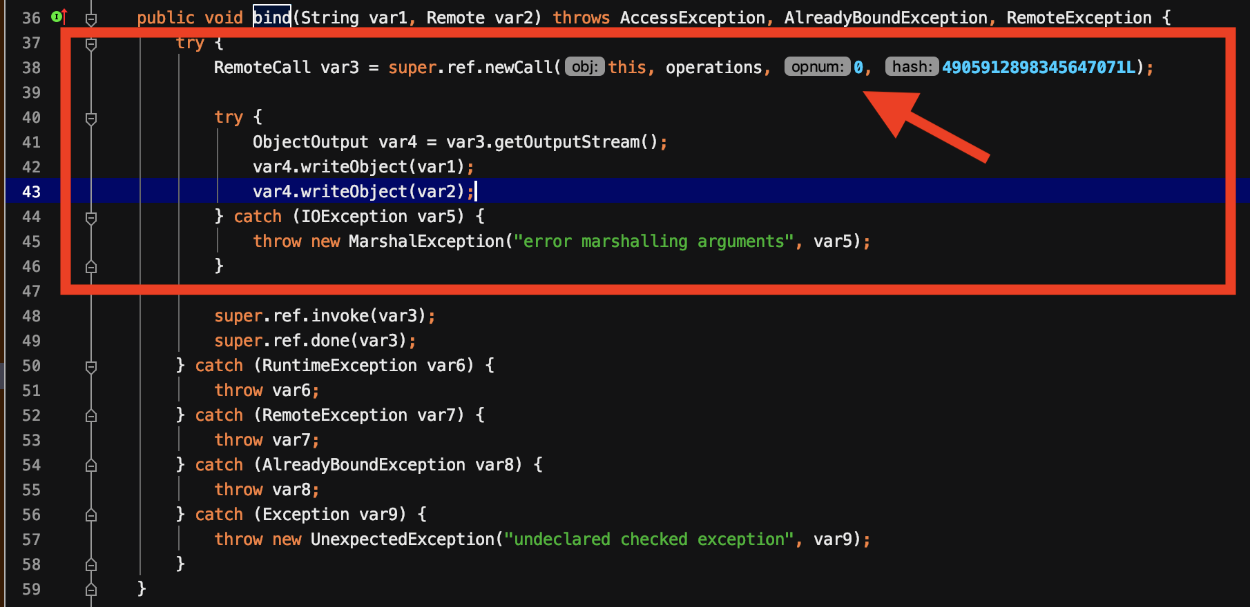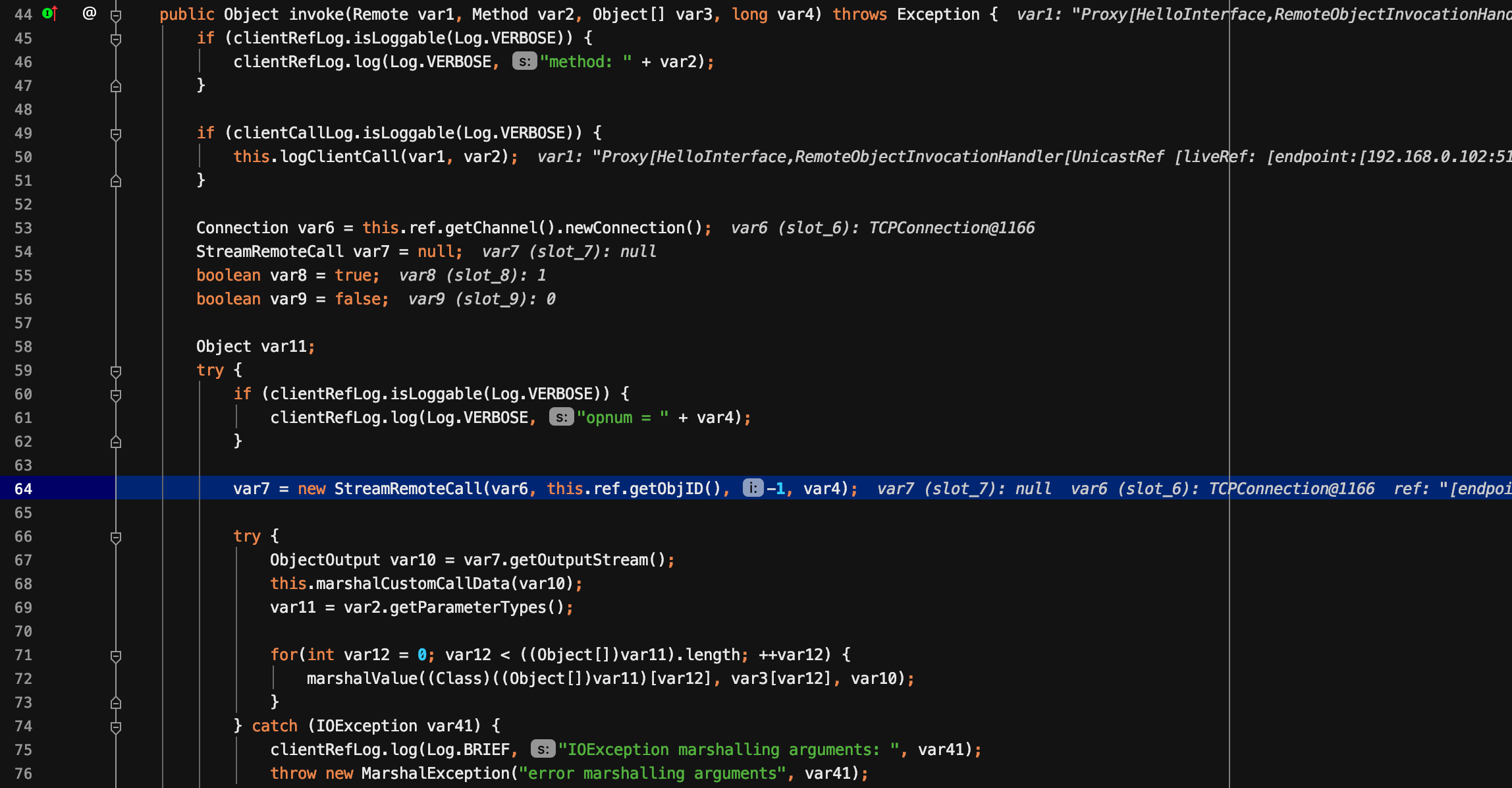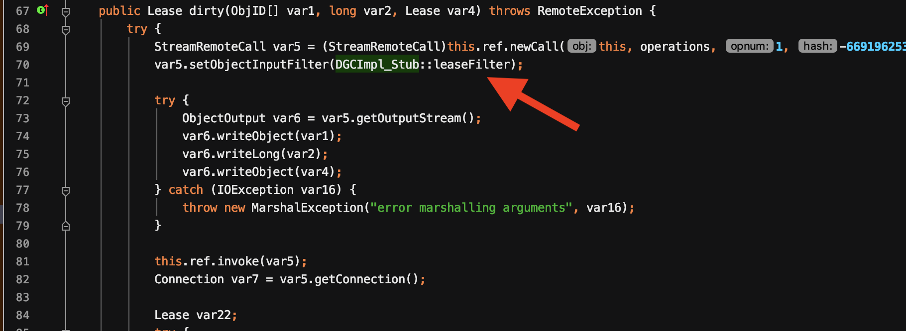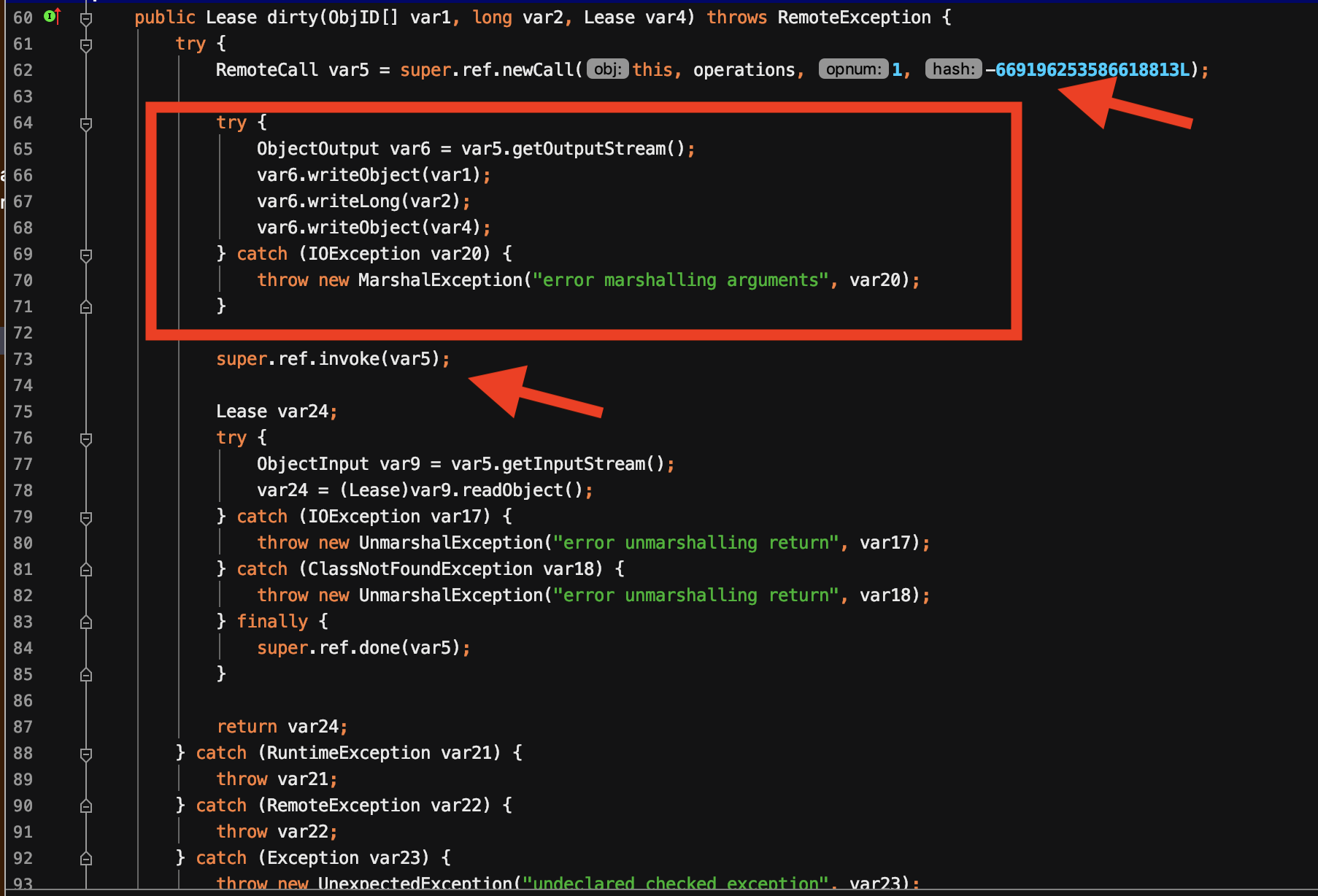 它的整个过程和前面lookup函数很像。可以看到它先新建了一个socket,然后经过一个过滤,将ObjID、var2以及Lease对象序列化到输出流中。然后执行UnicastRef.invoke函数。