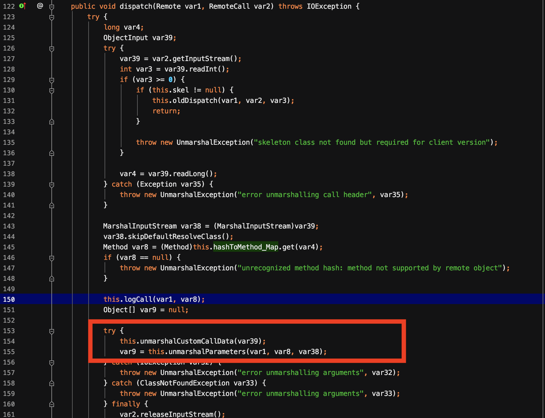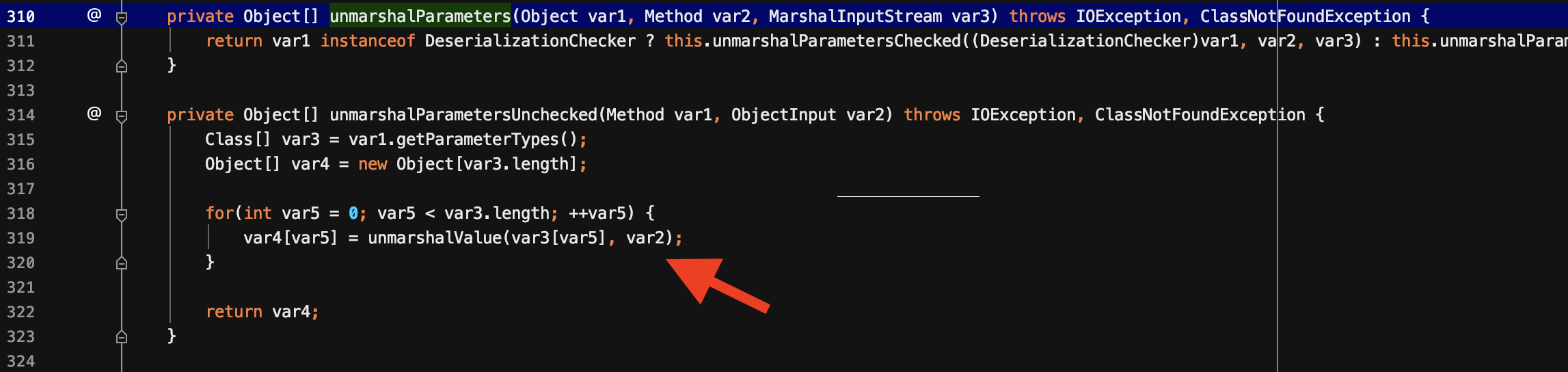 传入的var3为-1,直接进入后面,通过传入的var4,也就是方法的hash值,来查询到方法Method Var8。然后将输入流进行unmarshalCustomCallData,相当于解密一样。然后进入unmarshalParameters()函数,该函数中对var1进行了判断,然后进入unmarshalParametersUnchecked()函数,跟进该函数。