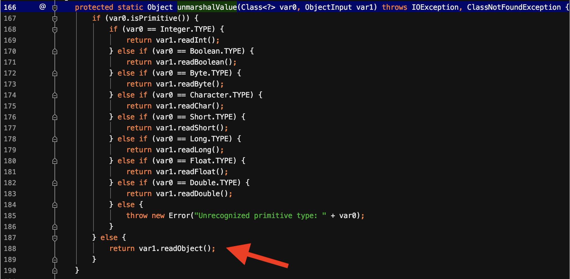 这里会根据参数类型进行反序列化,若参数类型不是原生类型,则就直接进行object的反序列化readObject。