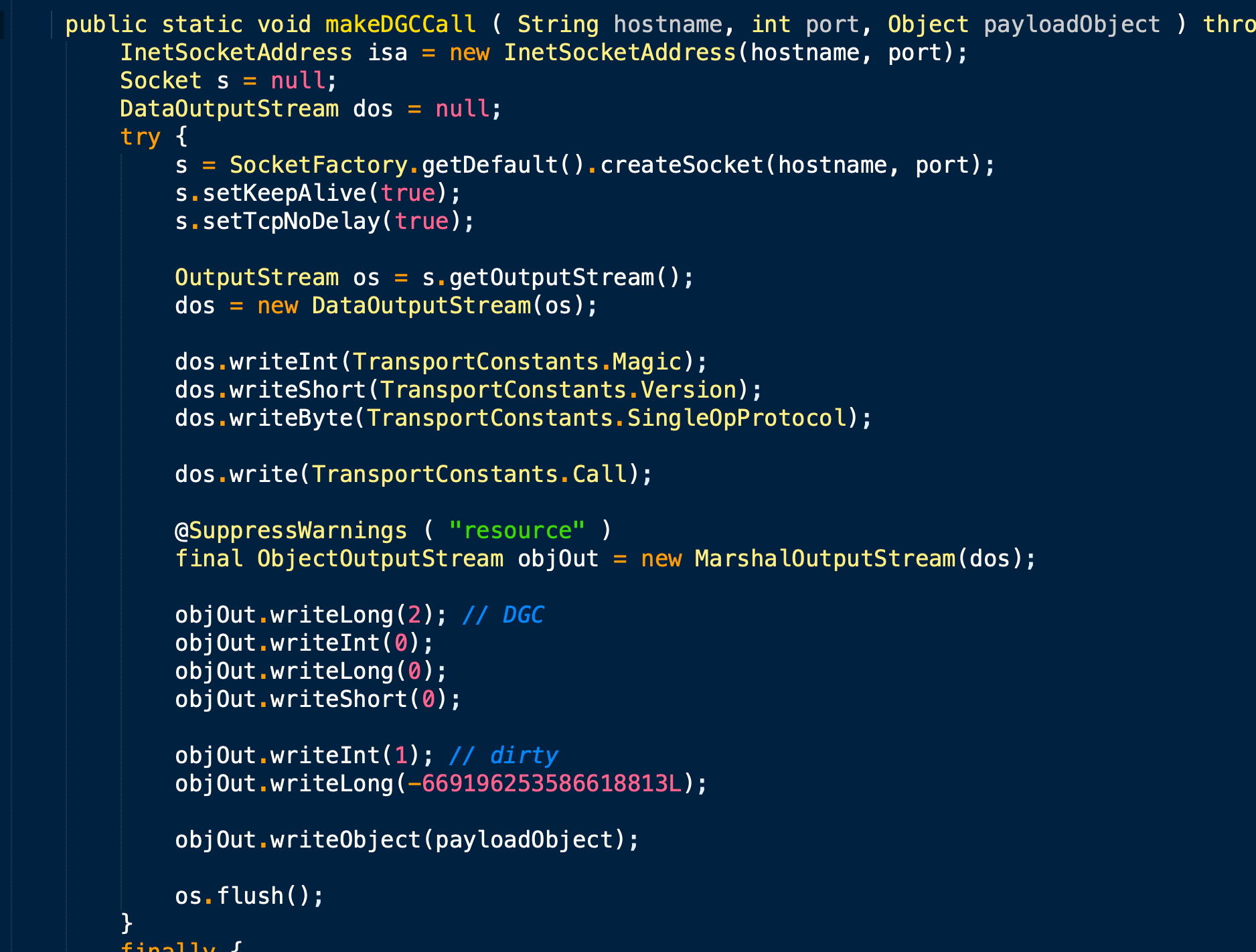 除了以上容易想到的通信方式,还有DGC(分布式垃圾收集),这是RMI框架用来管理远程对象生命周期的机制。可以通过与DGC通信的方式发送恶意的payload让注册中心反序列化。
