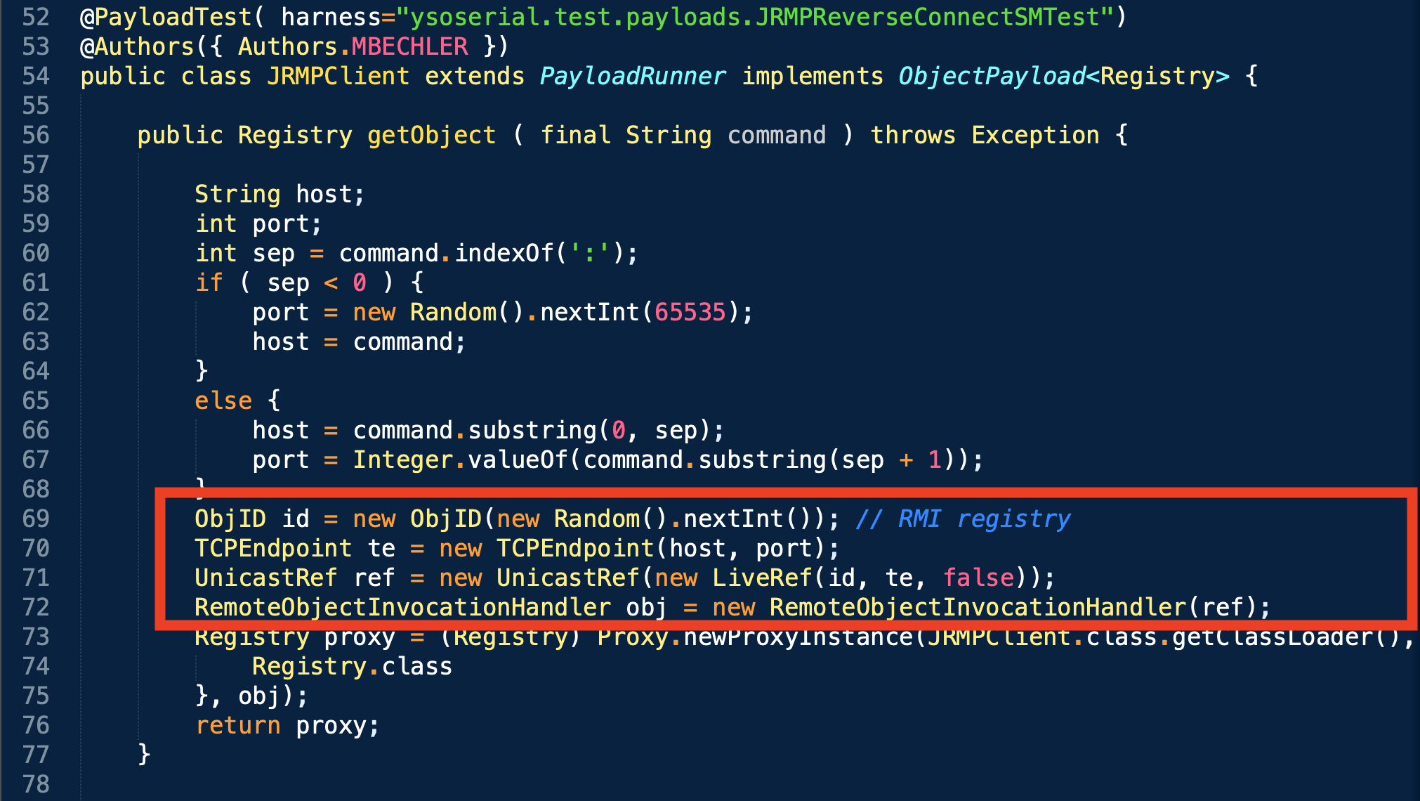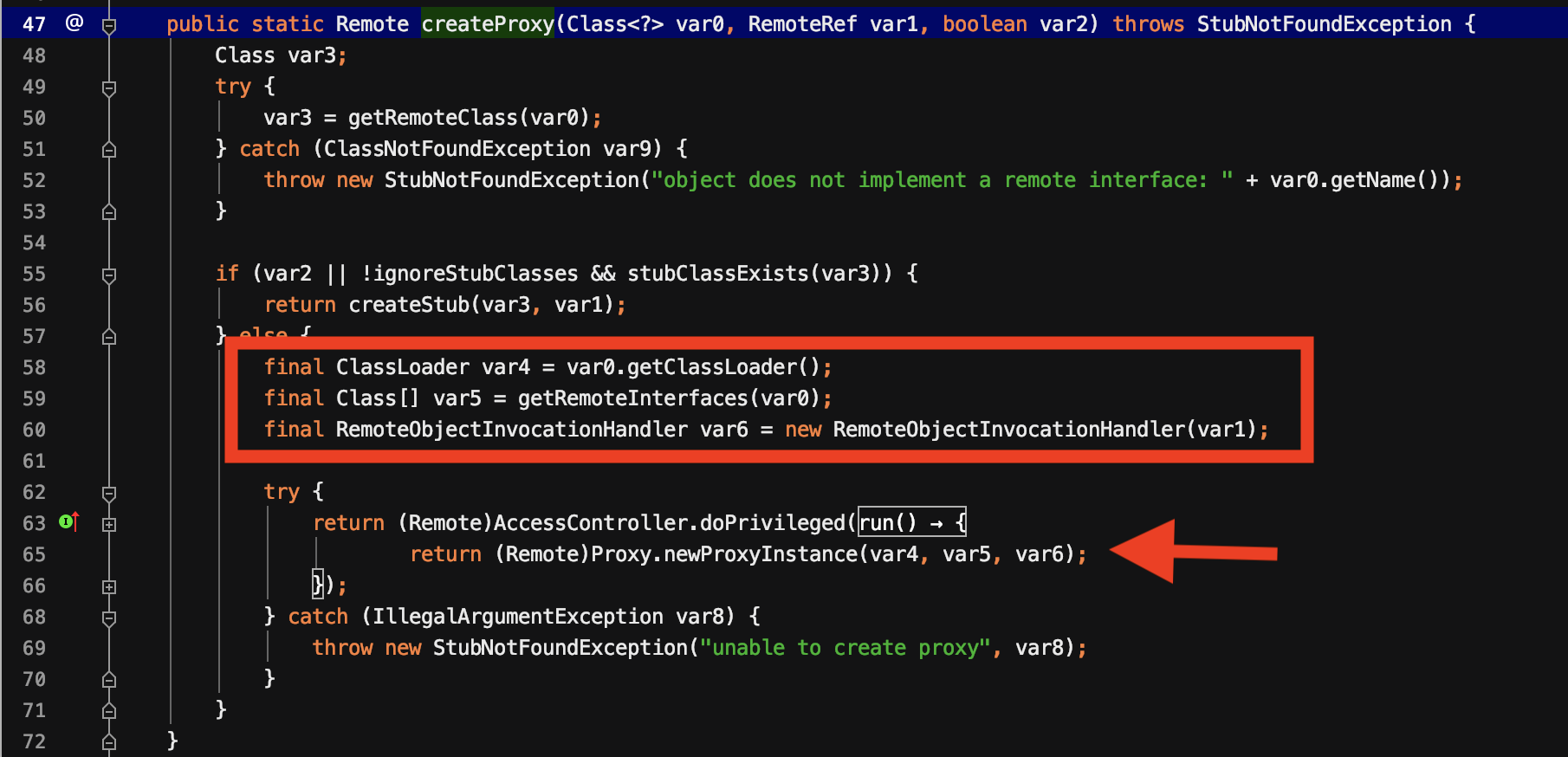 在该函数中,使用动态代理处理类RemoteObjectInvocationHandler作为UnicastRef动态处理类。到这里整个连接过程结束了。事实上只需要封装一个包含恶意注册中心的host、port的UnicastRef类,然后使用RemoteObjectInvocationHandler动态代理它。