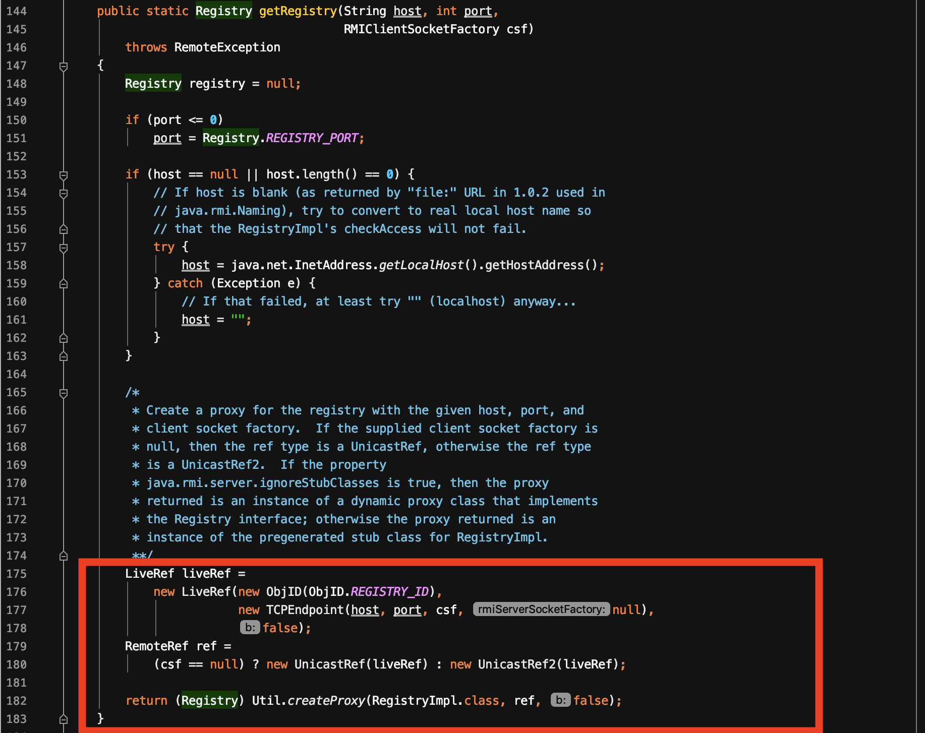 来看一下客户端连接上注册中心的具体实现,定位到java.rmi.registry#getRegistry。