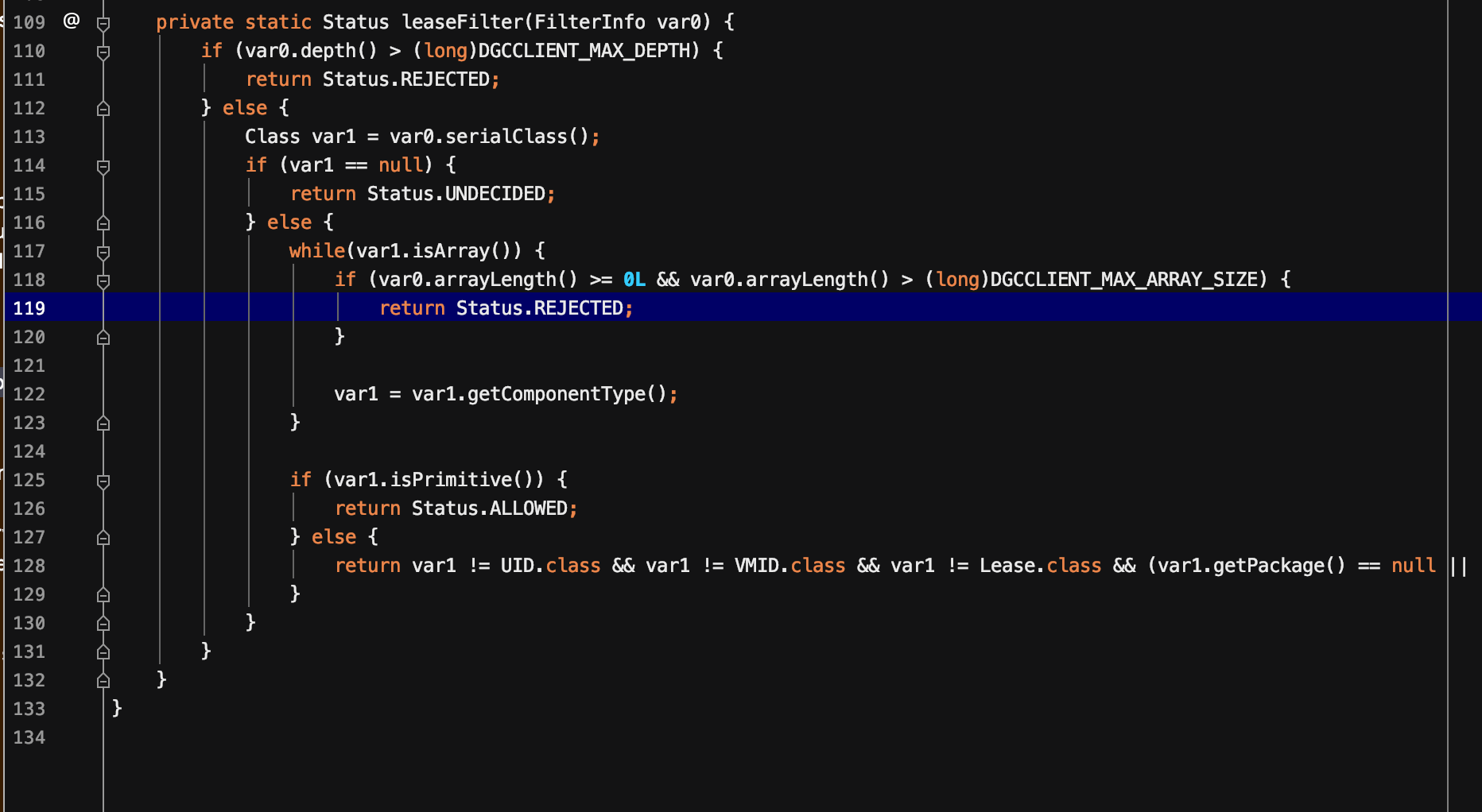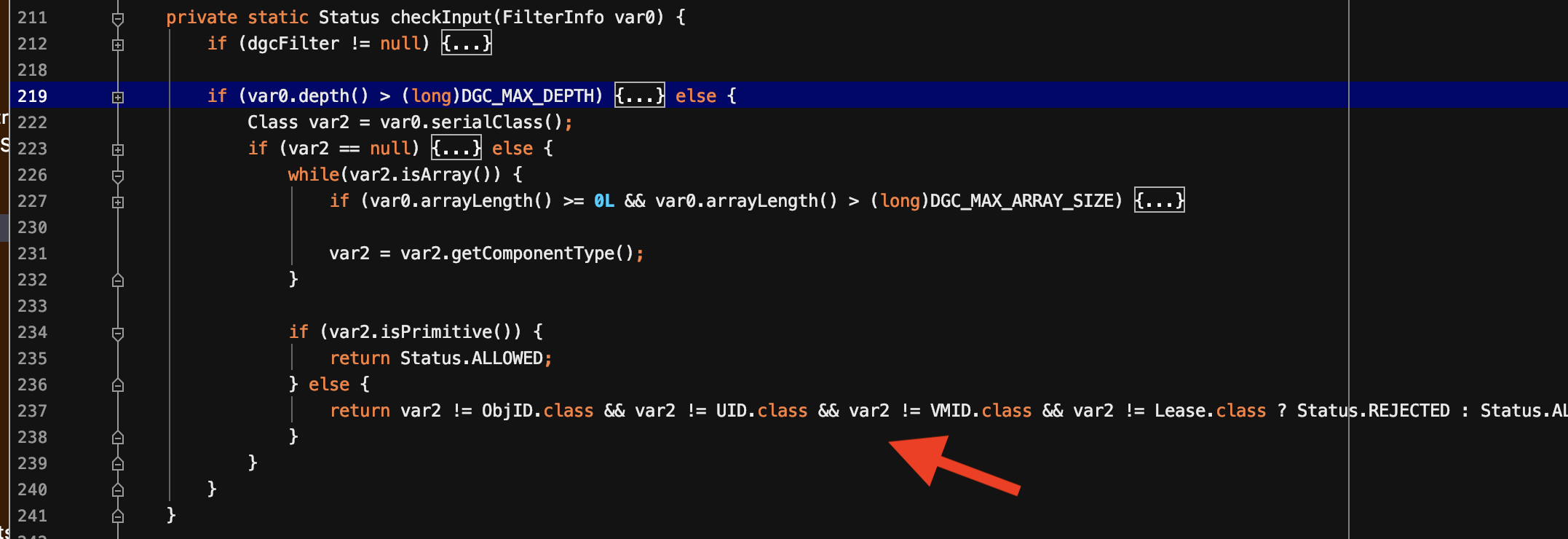 JEP290同时也对DGC这种通信方式进行了反序列化类的过滤,定位到DGCImpl#checkInput。