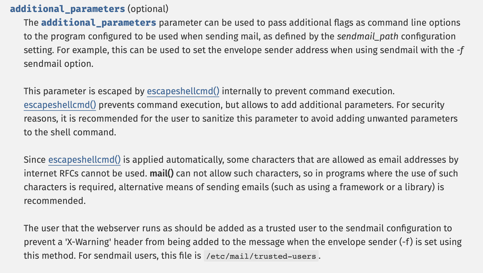 该参数可选,且可通过添加附加的命令作为发送邮件时候的配置,如-f参数设置邮件发件人。传入的参数会经过escapeshellcmd()函数过滤以阻止命令执行。整个问题转化为了找到能够绕过过滤并且能利用的命令参数。可查看sendmail MTA手册http://www.sendmail.org/~ca/email/man/sendmail.html
