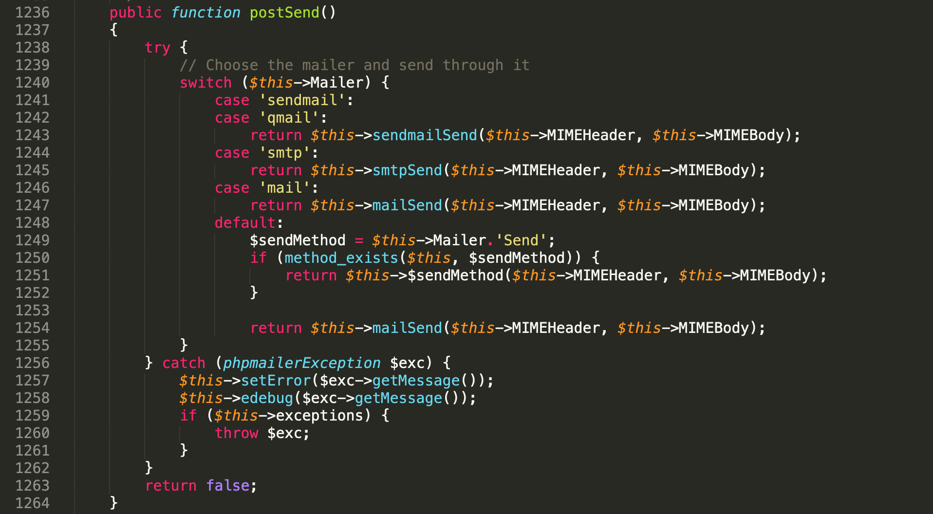 然后再来了解一下,PHPMailer的程序调用流程。正常情况下,使用PHPMailer的案例代码如下: