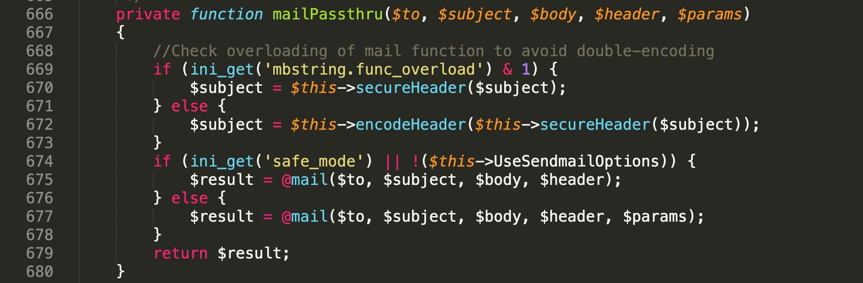 从后往前看,需要调用mail()函数的第5个参数,需要满足1)未开启safe_mode; 2)UseSendmailOptions为True。第二个条件默认满足,只需要满足第一个条件。