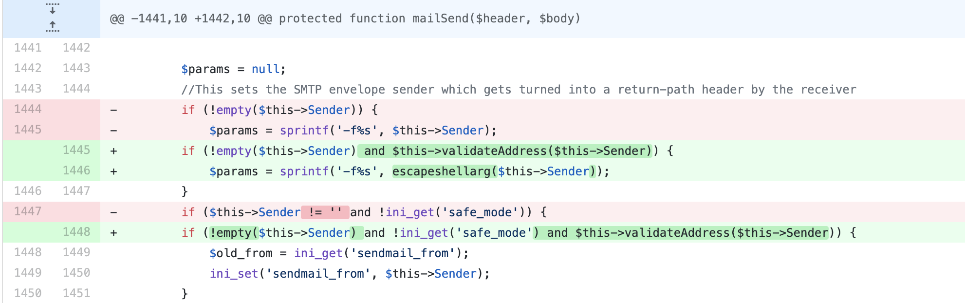 在5.2.18中的修复方式是在添加-f参数前,对Sender进行escapeshellarg()进行过滤。