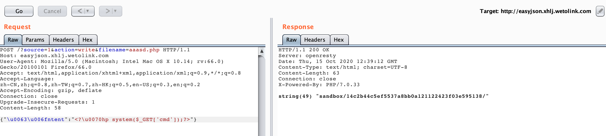 当action为write时,且文件名和文件内容通过SecurityCheck后,就会将内容进行json_decode(),然后上传文件。