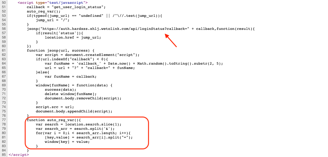 在这段代码的前面还可以看到有一个auto_reg_var()函数,可以达到变量覆盖的效果,控制前callback的值。在发送jsonp请求时,首先创建一个script元素,然后将"https://auth.hardxss.xhlj.wetolink.com/api/loginStatus?callback=" + callback的值赋值为script.src。