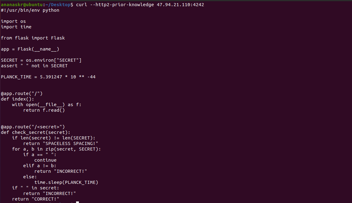 分析程序逻辑,首先可以爆破secret的位数,接下来爆破每一位的具体值看起来应该使用时间侧信道。即比较时若匹配失败直接返回,匹配成功则会sleep一个很小的时间,进行下一次的匹配直接匹配失败返回。因此某一位匹配成功时,返回的响应会晚一些。如果是采用测量时间差的方式,会受到很大的网络扰动,这根本不可能成功。但是在HTTP/2.0协议下,可以不用测量时间差就可以获得返回响应的顺序。这道题目的作者参考了USENIX2020的一篇论文”Timeless Timing Attacks: Exploiting Concurrency to Leak Secrets over Remote Connection”。这篇论文中介绍了这样的利用方式。