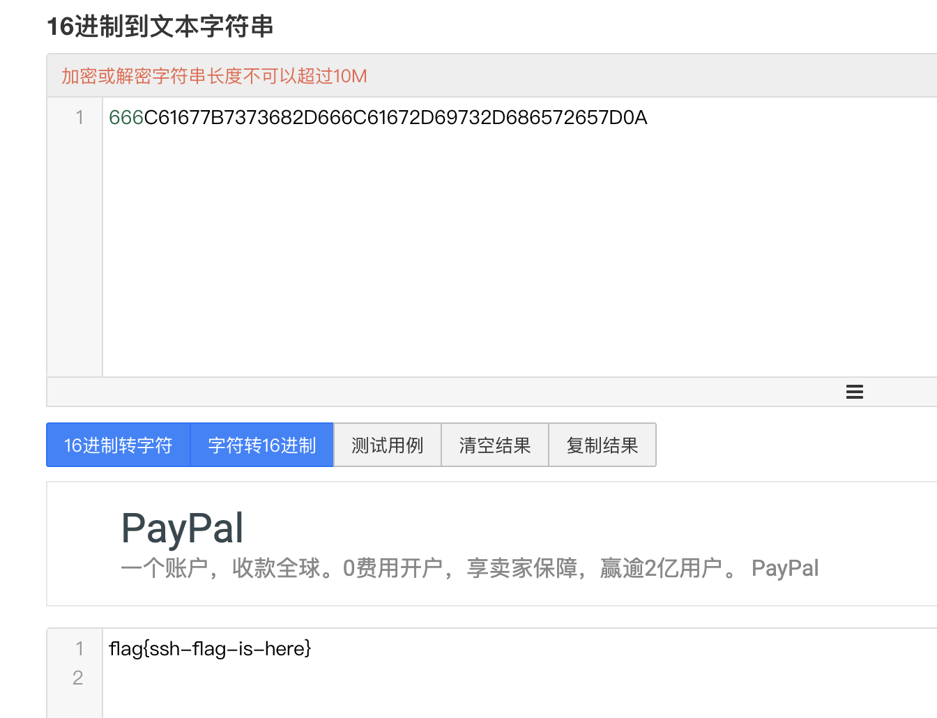发送完之后,这条指令就会被执行,因此flag内容被存入了/tmp/flag.pub中,此时只需要向../../../../../tmp/flag发送消息,就会将/tmp/flag.pub内容十六进制编码后显示出来。最后获取到了flag。