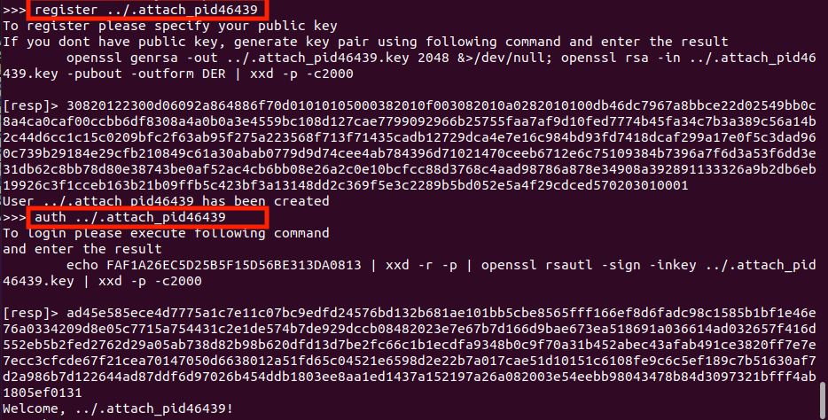 - Auth username。 应用程序会产生一个值并要求用户用key进行加密以验证其身份。验证成功则会监听一个unix socket,等待即将到来的message。socket文件在当前目录的socket/目录中,文件名为username。