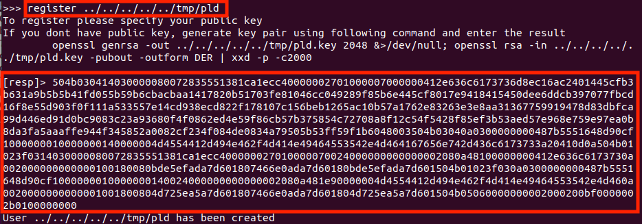 - Register username。 应用程序会请求public key并将其存储在当前目录的keys/目录中,文件名为username.pub。
