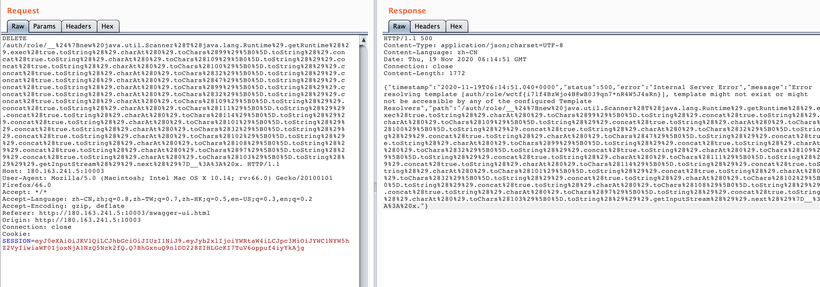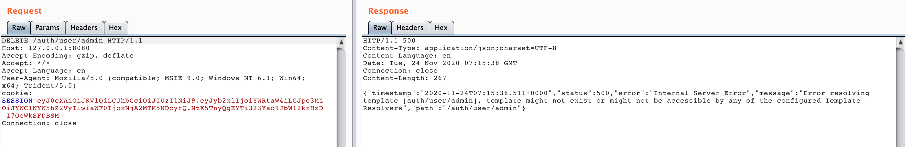 提示找不到模版,说明将/auth/user/admin作为模版,寻找对应的.html文件。当path中存在双引号或者单引号时,会出现如下信息,需要绕过引号,方法很多。